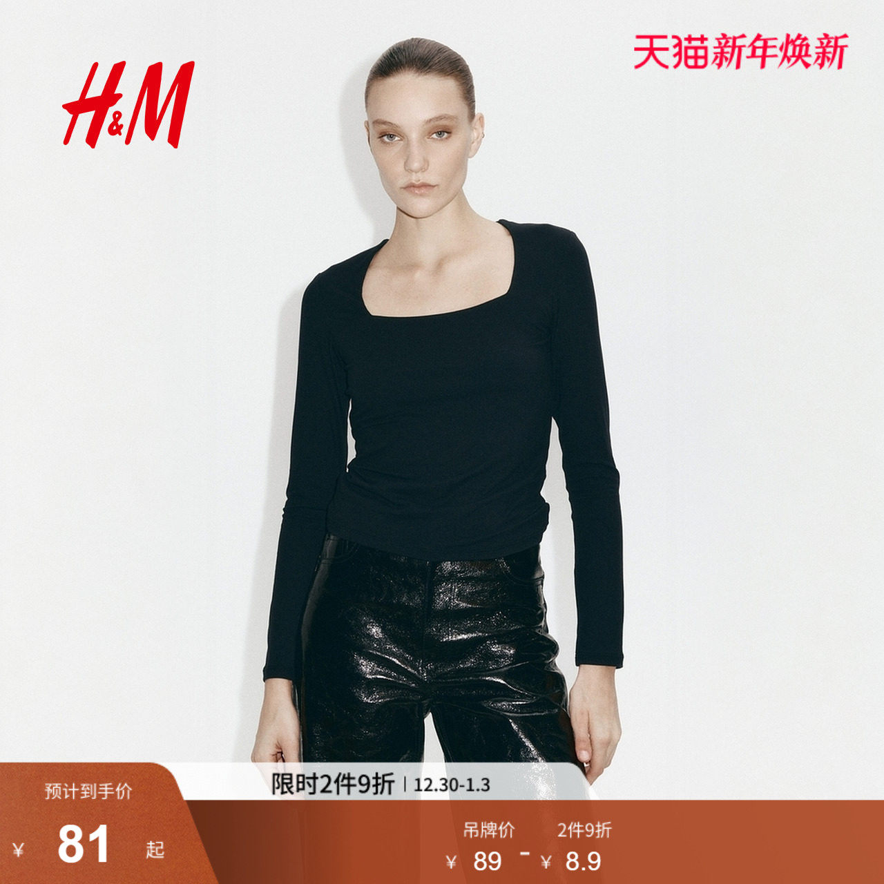 HM女装T恤冬季复古休闲方领显瘦法式打底衫酒红色长袖上衣1089811