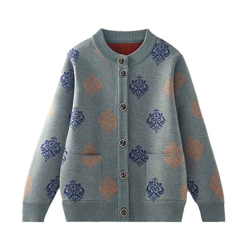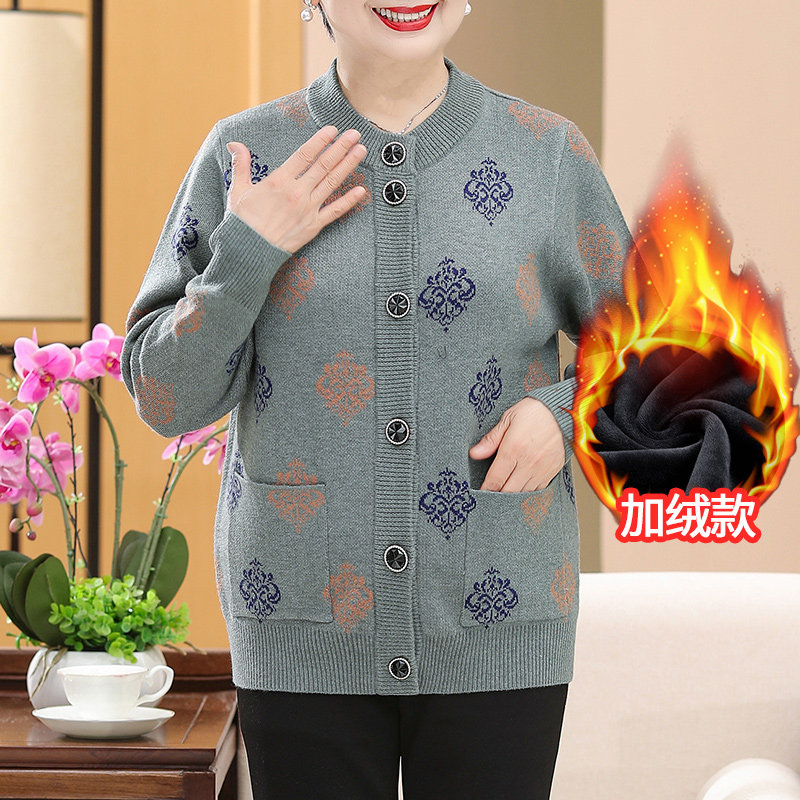 恒源祥洋气上衣中老年女装新款单排扣夹克外套加绒厚秋冬针织开衫