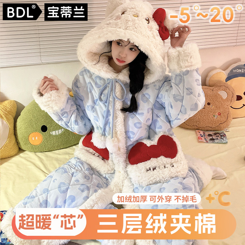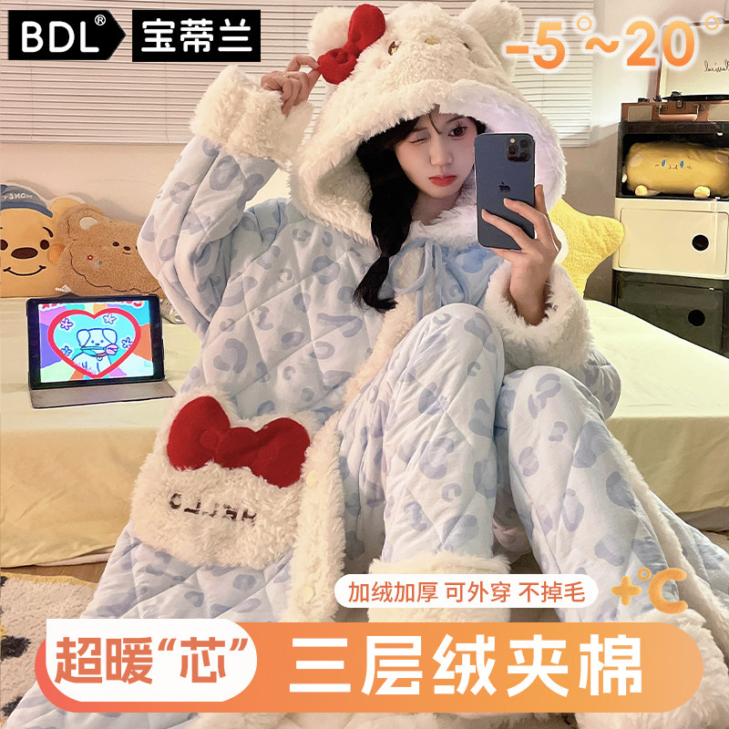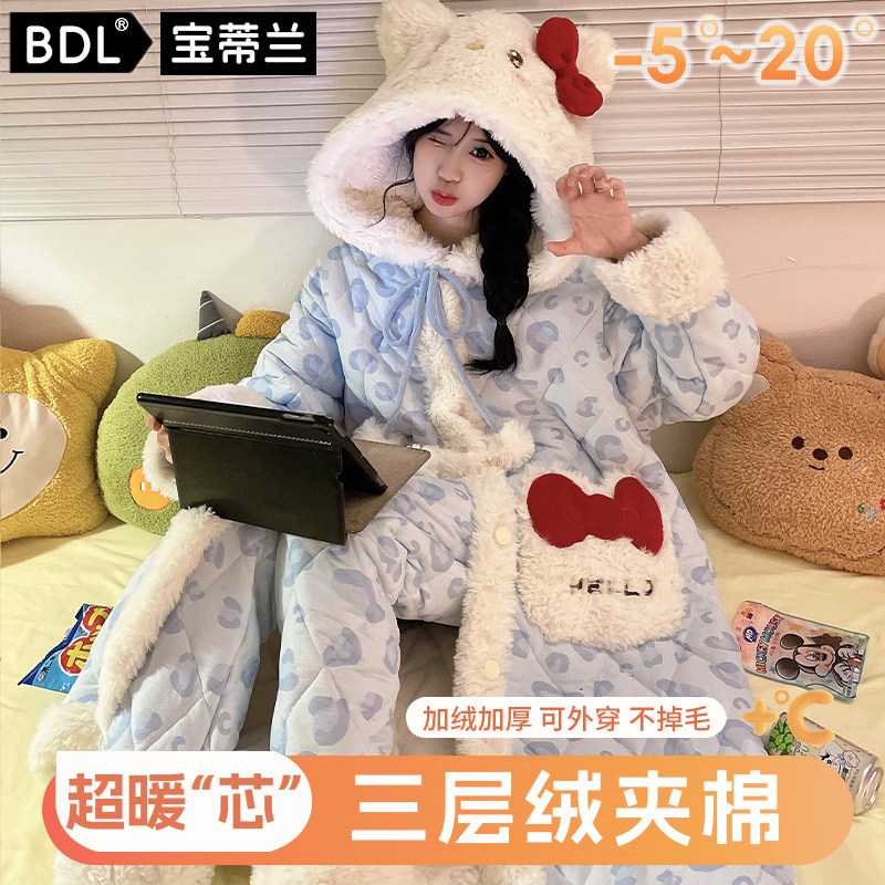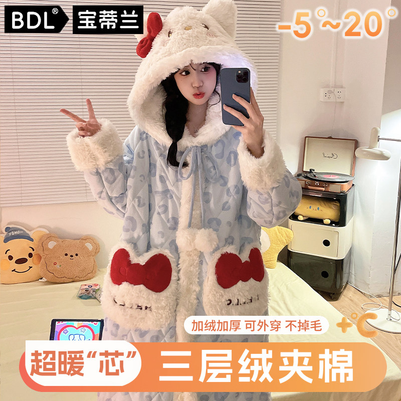 新款睡袍女冬季三层夹棉睡衣加绒加厚保暖家居服套装长款可外穿