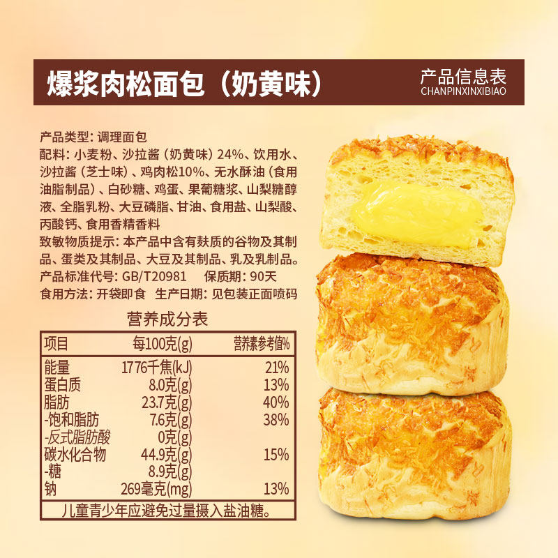 泓一爆浆肉松面包奶黄味健康学生早餐面包休闲下午茶点心
