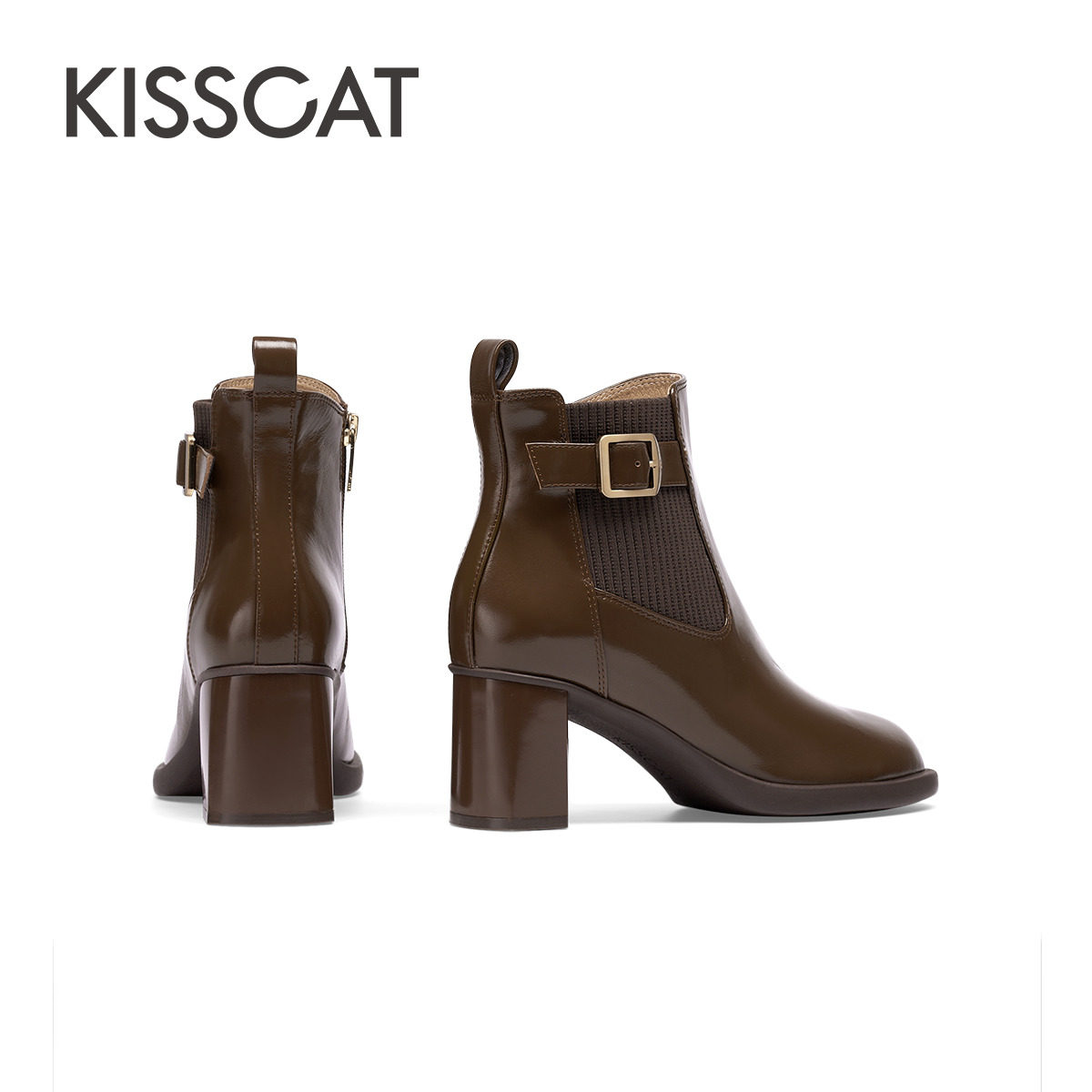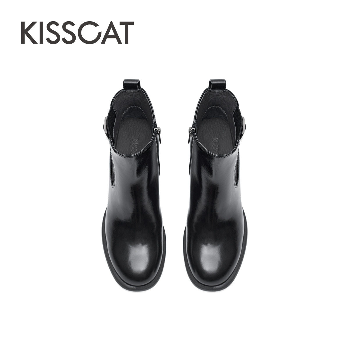 KISSCAT接吻猫春季真皮复古时装靴法式高跟瘦瘦靴西部粗跟短靴女