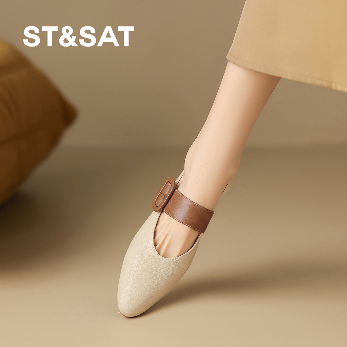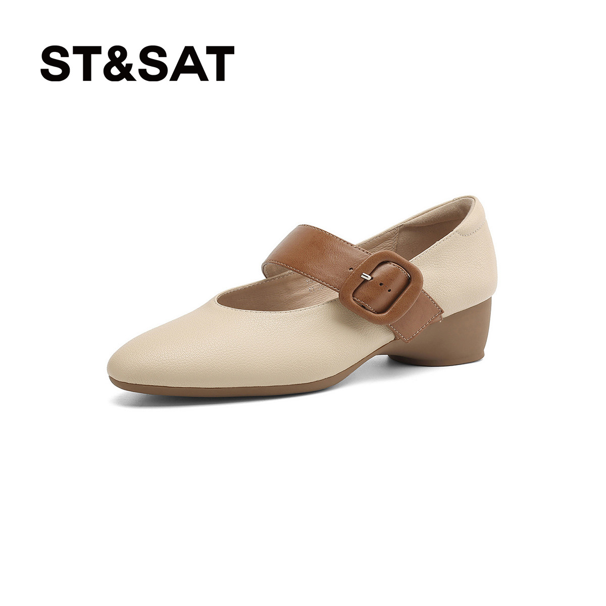星期六复古拼色百搭女单鞋2025春季新品浅口粗跟女鞋不累脚小皮鞋