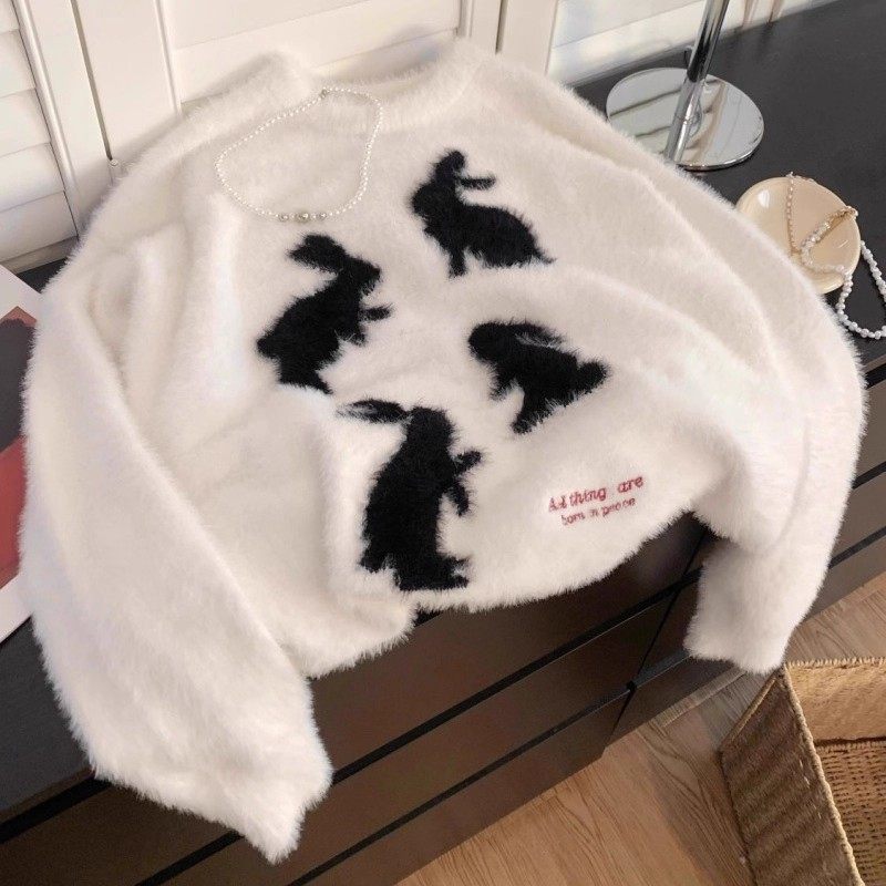 白色圆领水貂绒套头毛衣女秋季慵懒风针织衫宽松大码内搭上衣秋冬