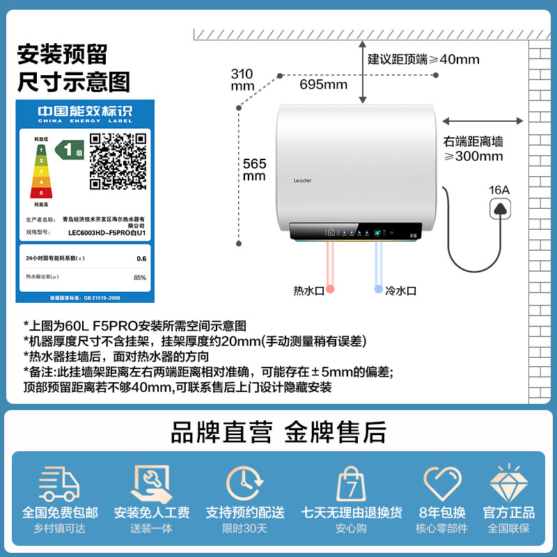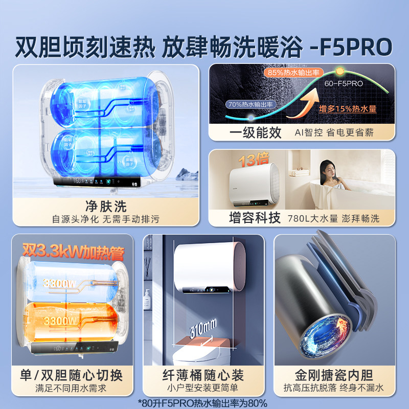 【焕新补贴】海尔出品统帅电热水器洗澡家用一级能效免清洗F5PRO