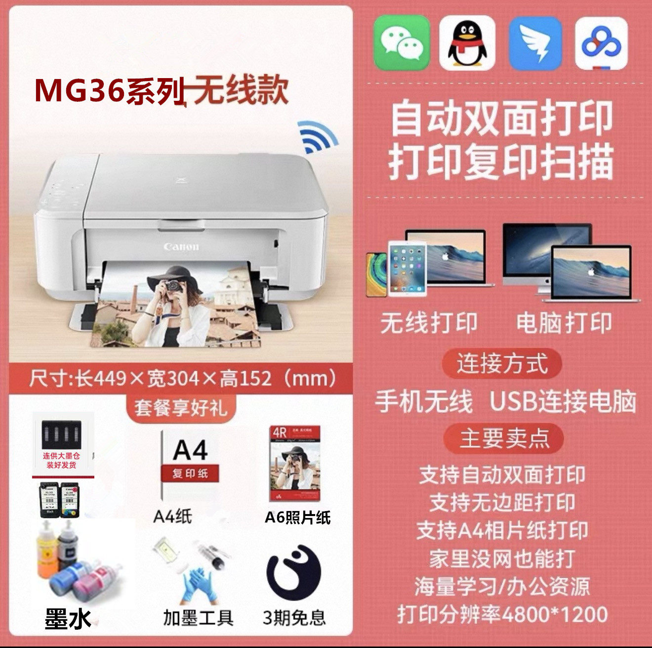 佳能3680彩色打印机家用小型复印扫描一体机手机无线照片办公墨仓