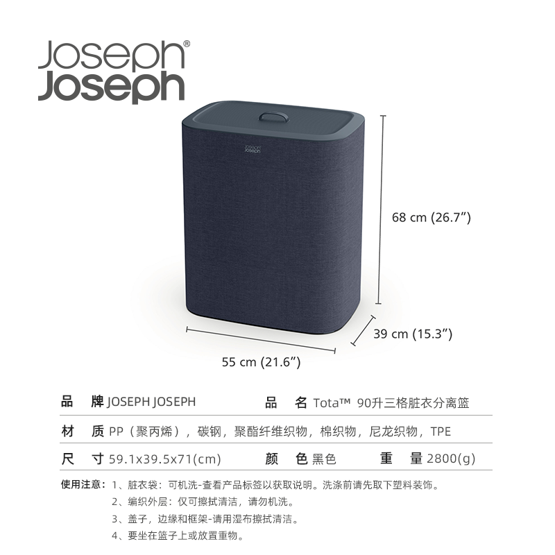 JosephJoseph家用三格分类脏衣收纳分格洗衣篮脏衣篓大容量 50025