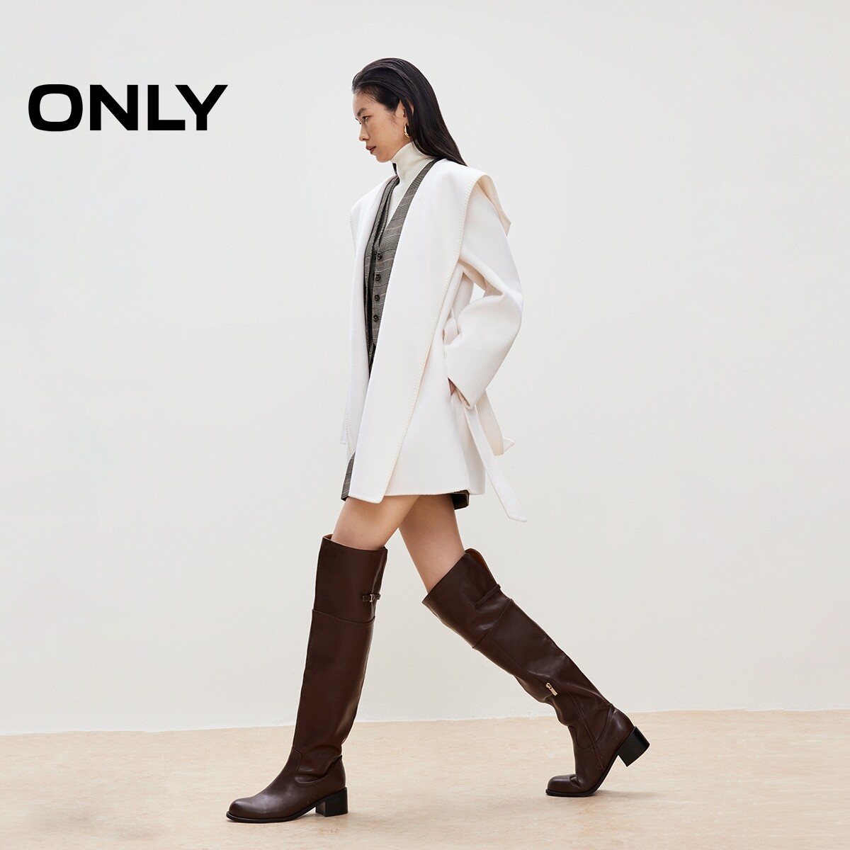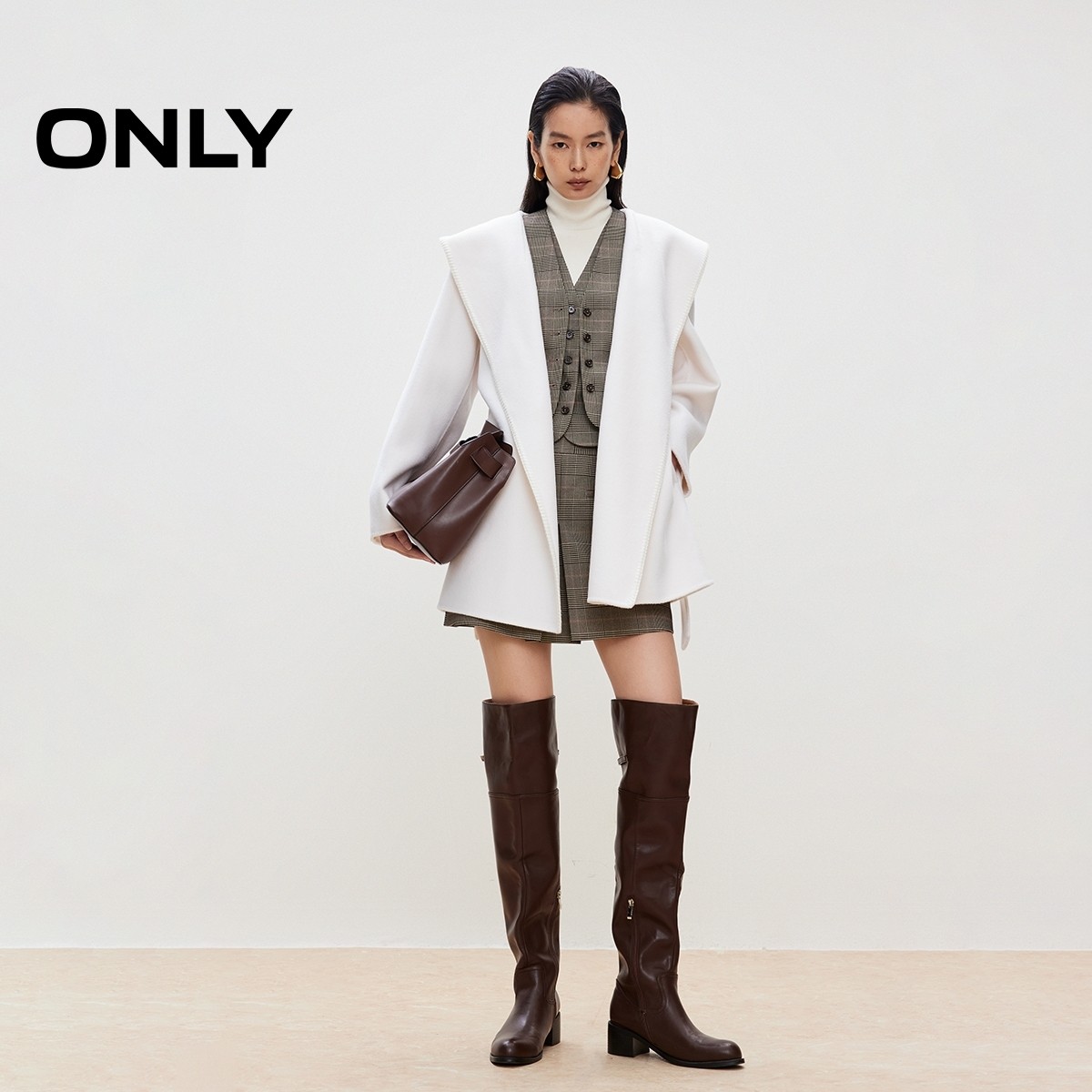 ONLY2025冬季新款慵懒风大兜帽斗篷系带绵羊毛双面毛呢大衣外套女
