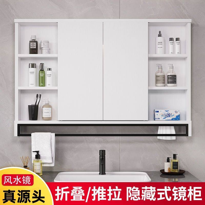 浴室智能风水镜隐藏式浴室镜卫生间镜子实木推拉折叠化妆镜置物柜