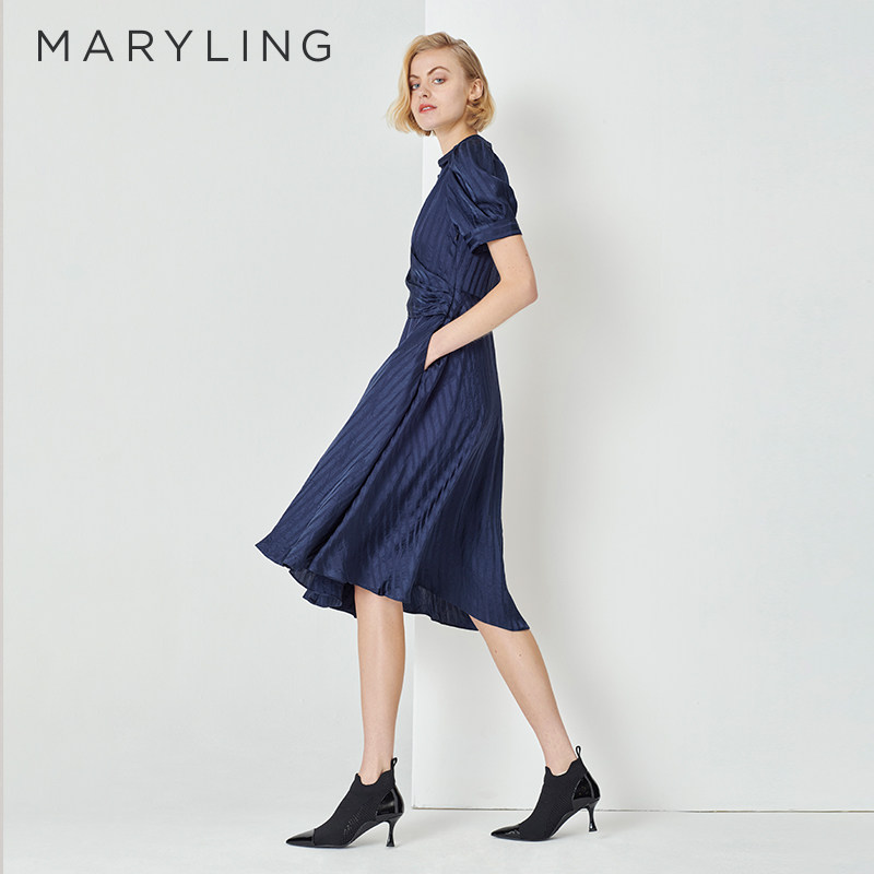 MARYLING玛俪琳初夏午夜蓝V领高级感条纹连衣裙A1DCW62460