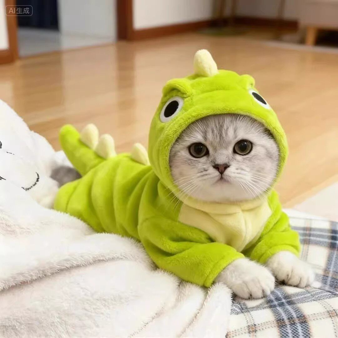 猫咪衣服新款法兰绒带牵引扣加绒加厚秋冬连帽幼猫宠物猫咪四脚衣