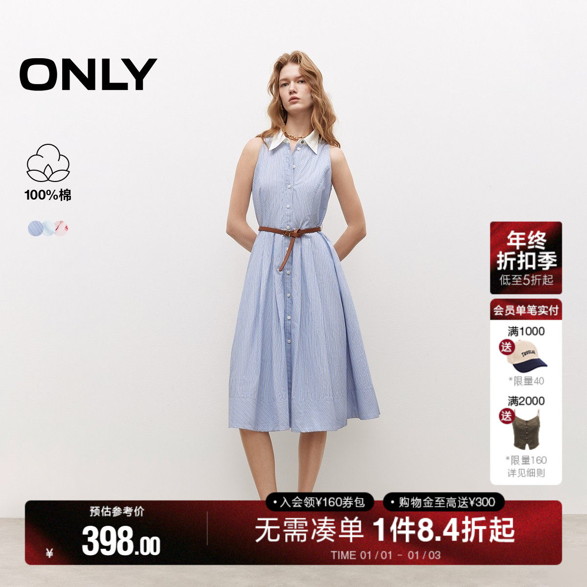 ONLY2025夏季新款拼接翻领浪漫清新印花/条纹收腰中长裙连衣裙女
