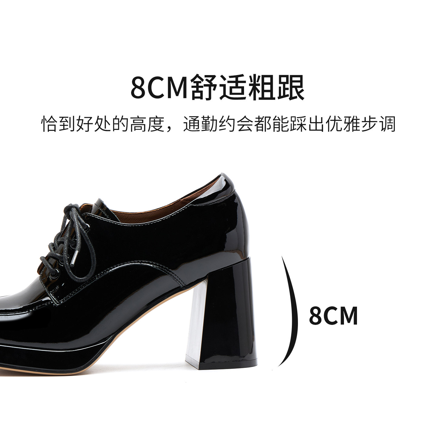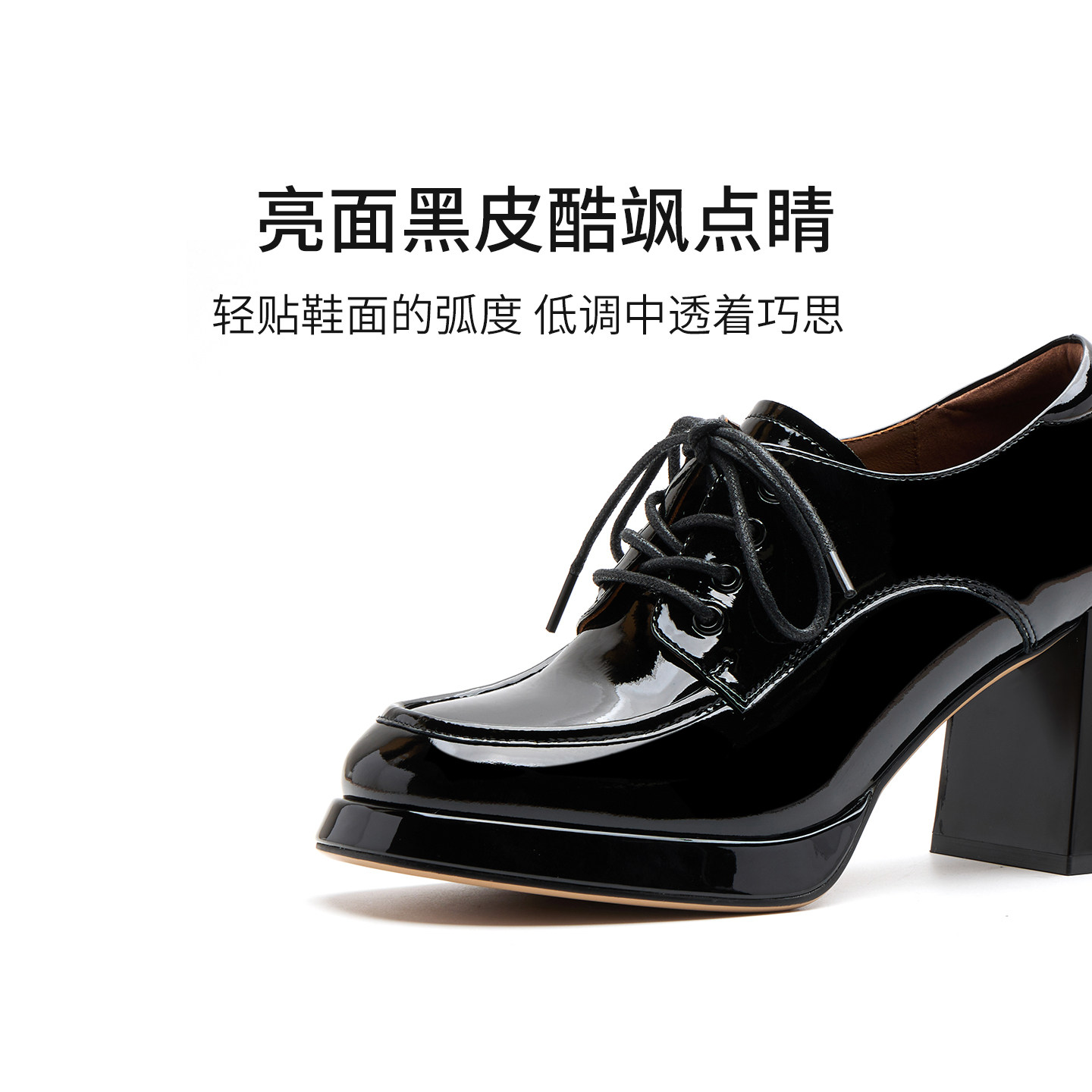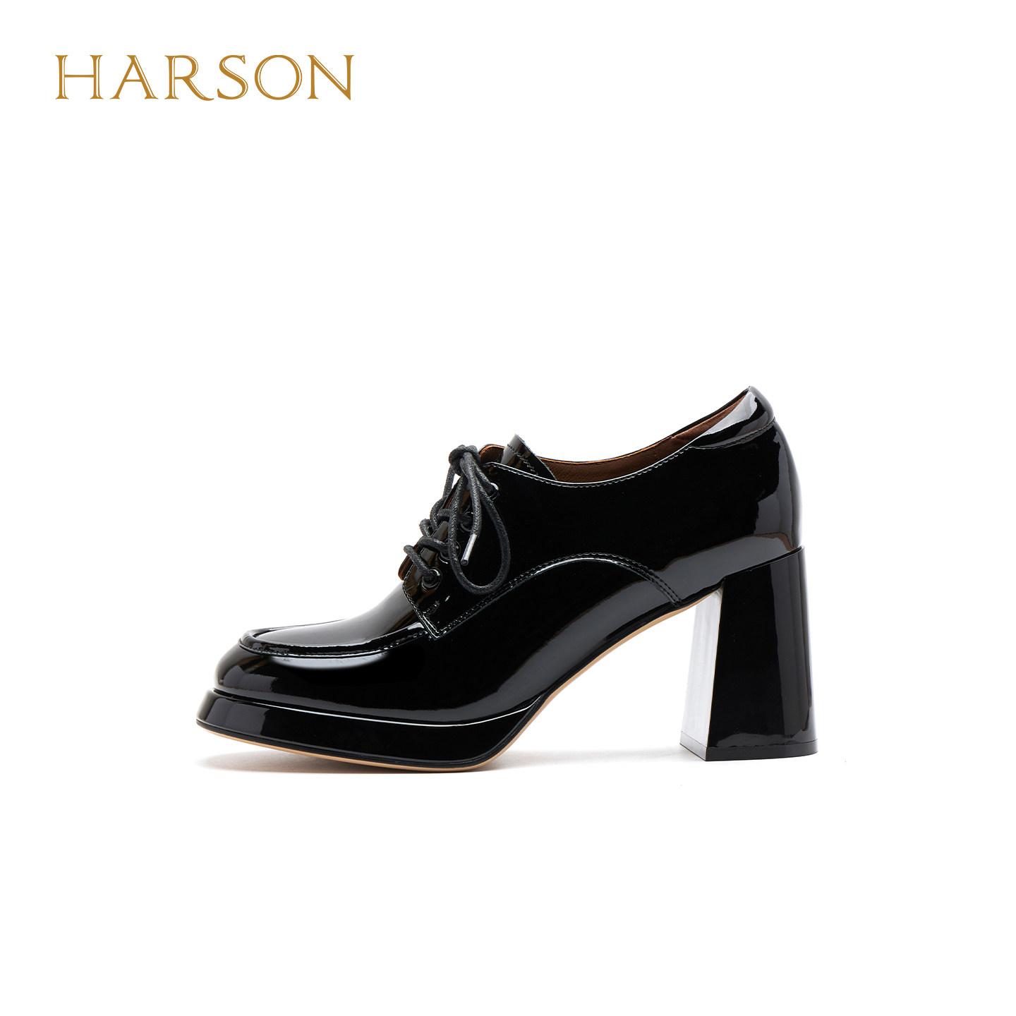 哈森时尚亮面乐福鞋女圆头粗跟舒适百搭高跟鞋2026新款HWS260168