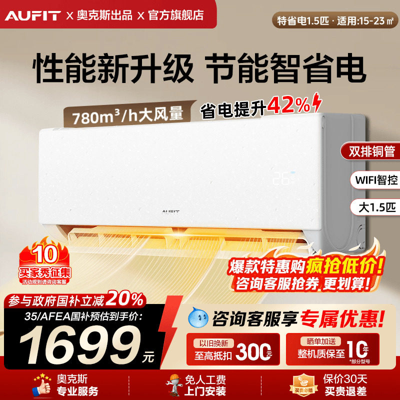 补贴]AUFIT空调奥克斯出品大1.5匹1匹一级能效变频冷暖智能家用2P