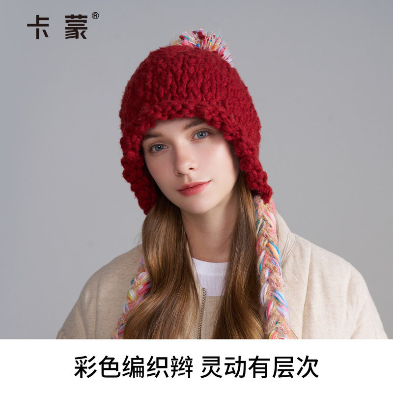 卡蒙帽子女士冬新款时尚洋气加厚保暖防风防寒护耳红色针织毛线帽