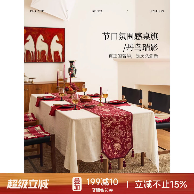 蜡笔派丹鸟瑞影桌旗红色现代轻奢茶几盖布喜庆节日新年礼物床旗
