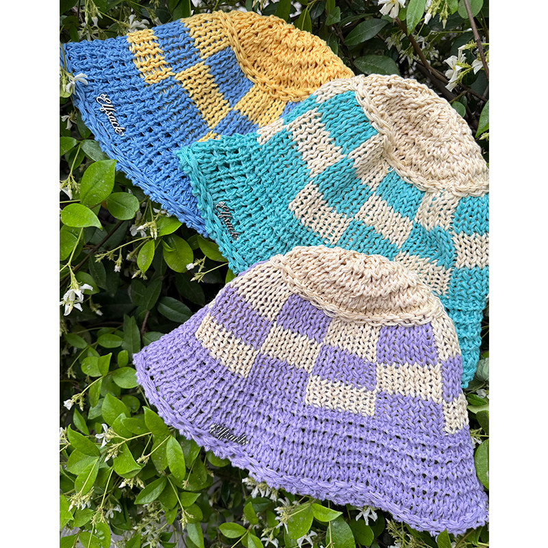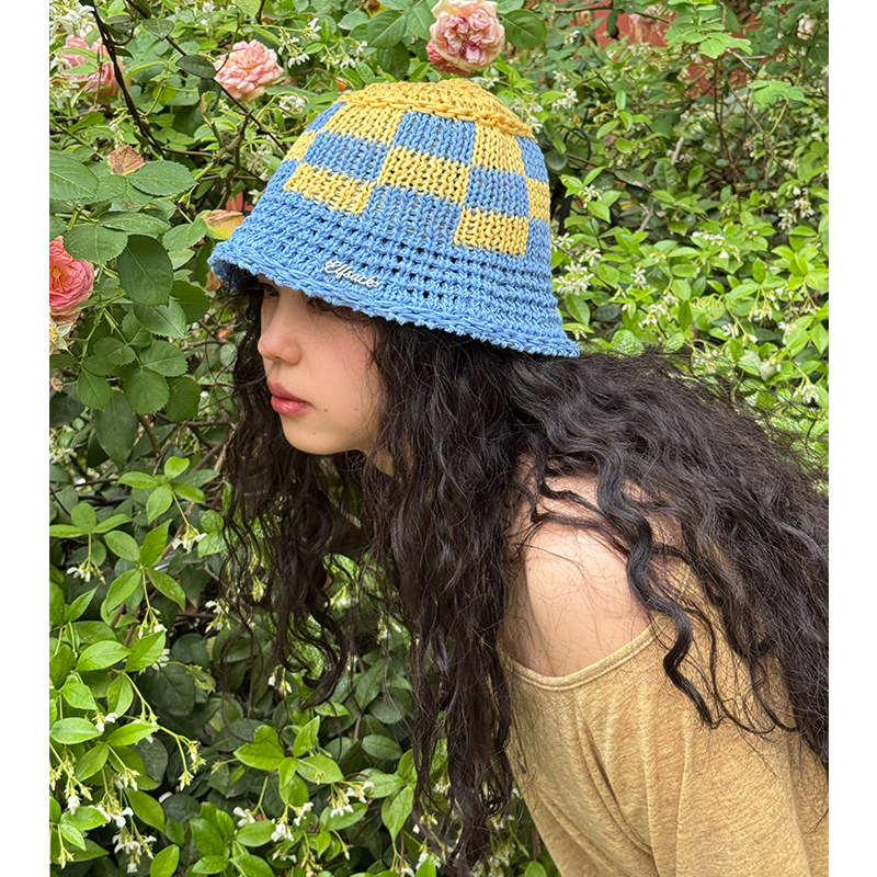 妖精的口袋撞色镂空格子渔夫帽2025新款显脸小甜美小清新百搭帽子