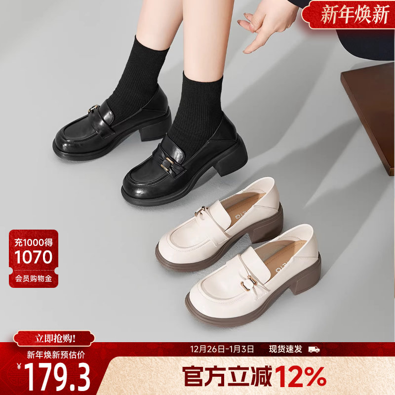 真皮~骄屿复古一脚蹬乐福鞋女厚底粗跟圆头单鞋百搭英伦风小皮鞋