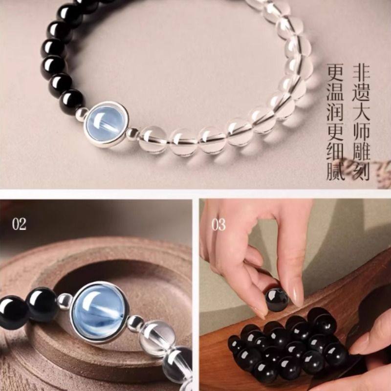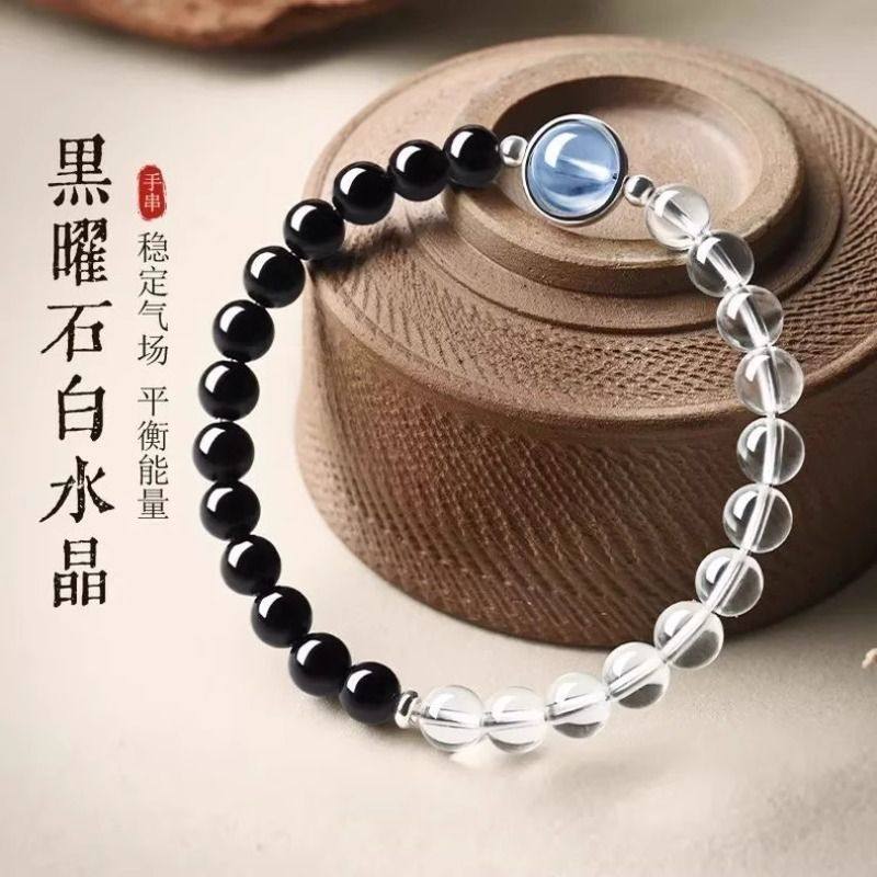 黑曜石白水晶海蓝宝手串天然女款水晶补水护身符招财转运珠手链男