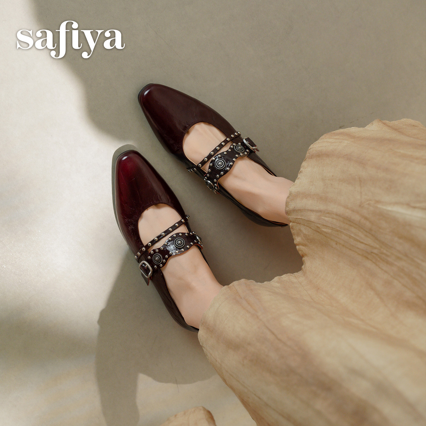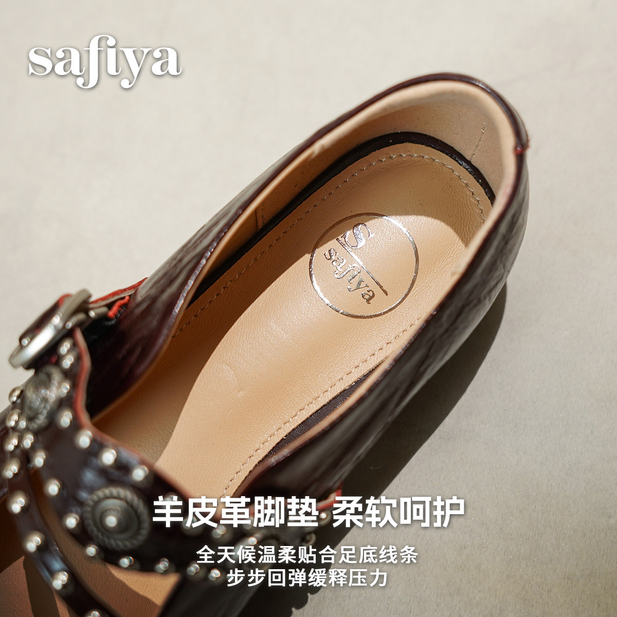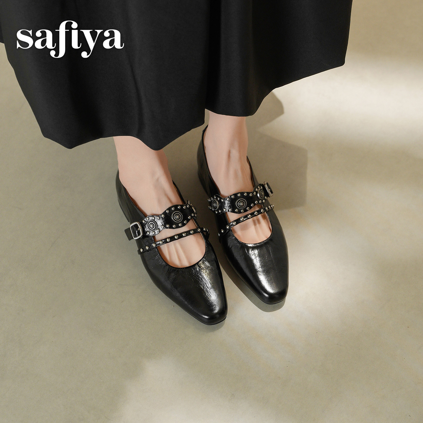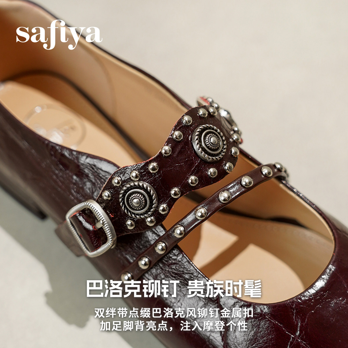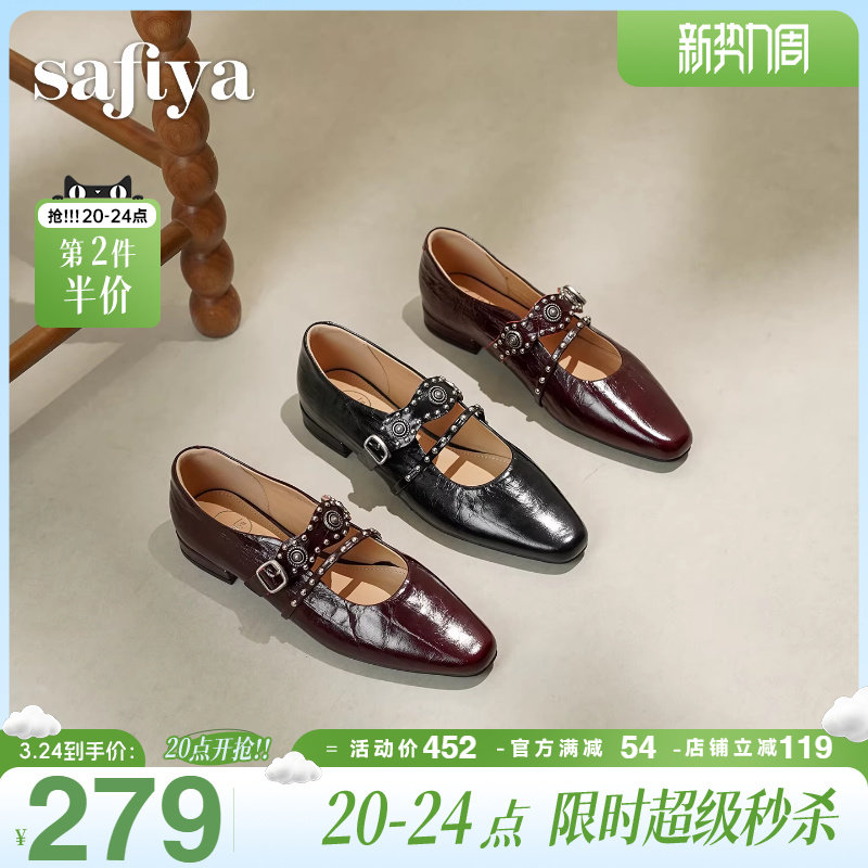 索菲娅2026春季新品法式真皮方头铆钉百搭浅口复古玛丽珍单鞋女