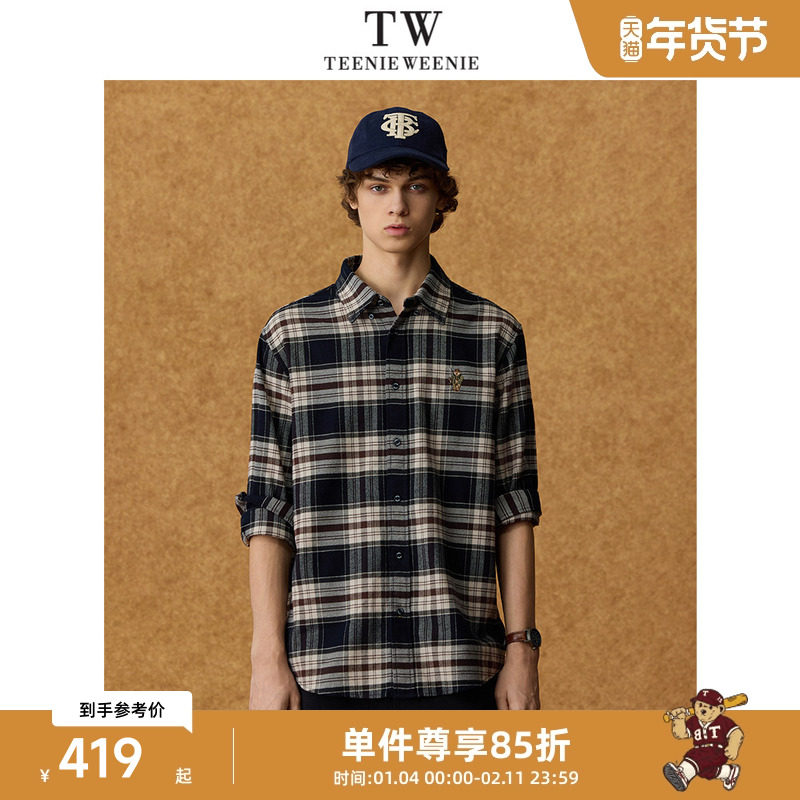 Teenie Weenie小熊男装熊刺绣宽松翻领简约通勤休闲格纹衬衫