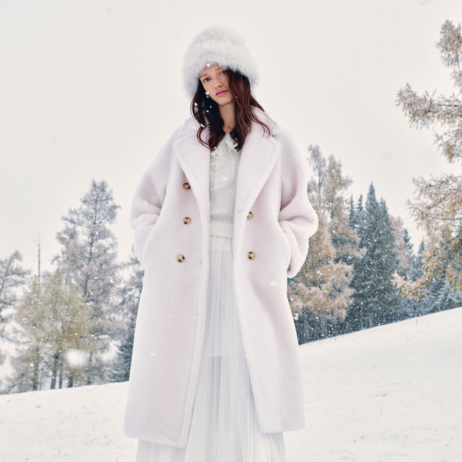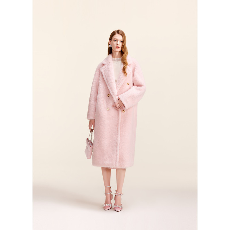 可可尼COCOON2025冬季新款通勤翻领高知休闲绵羊毛粉色皮草外套女