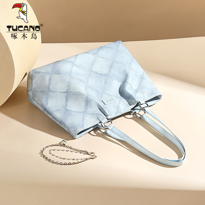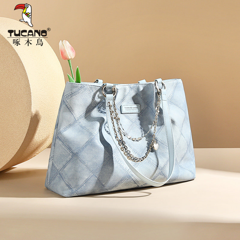 啄木鸟包包女2025新款高级感大学生上课通勤牛仔蓝单肩手提托特包