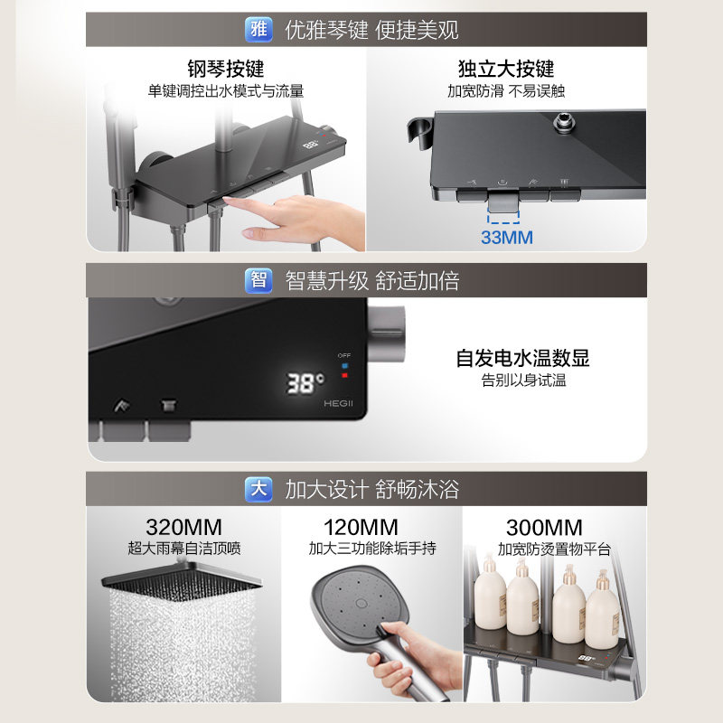 恒洁琴享系列水温数显钢琴键大平台花洒