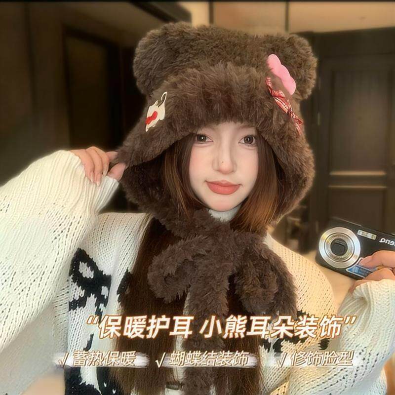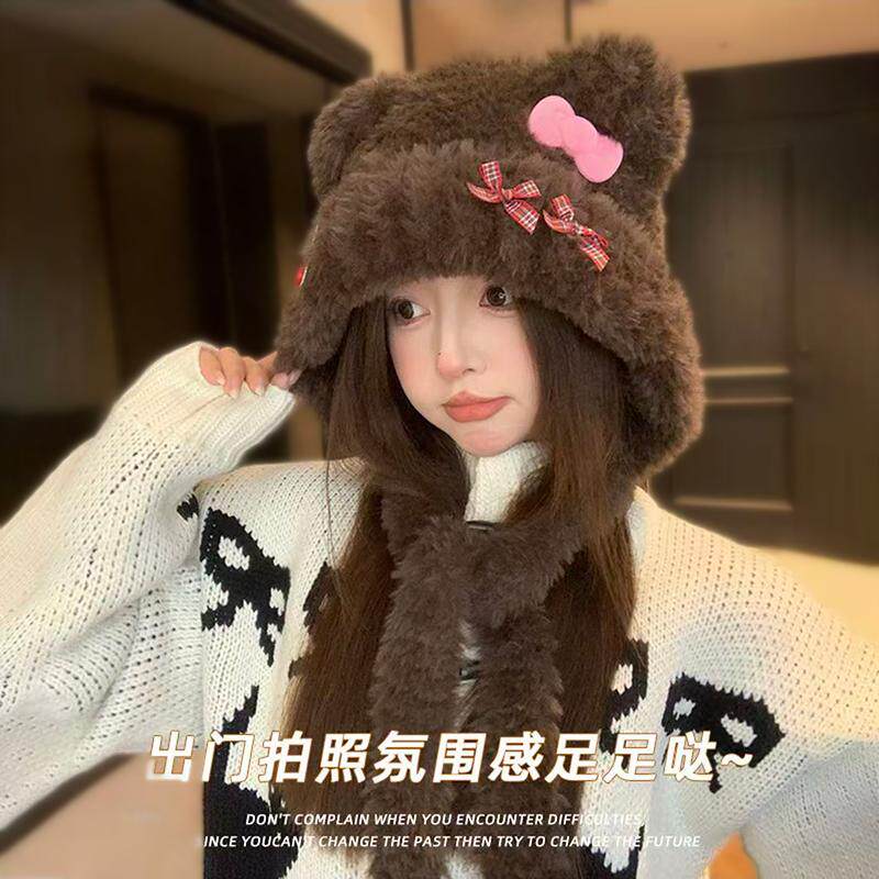 猫咪蝴蝶结小熊耳朵毛绒帽女冬季加厚保暖护耳帽新款针织雷锋帽子