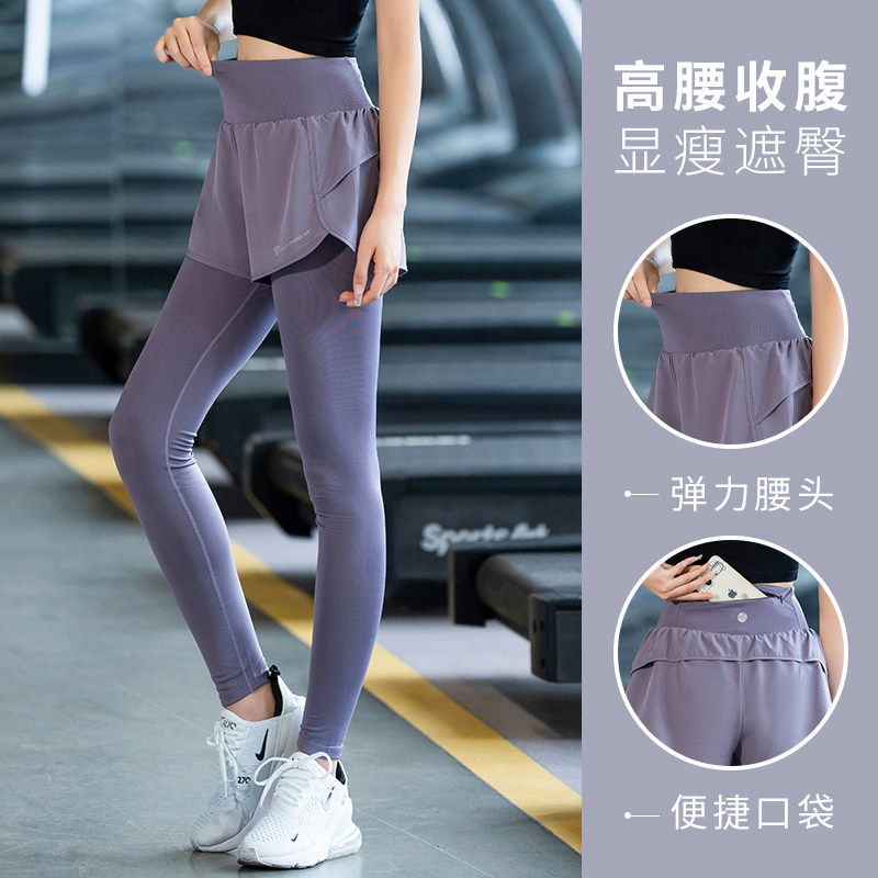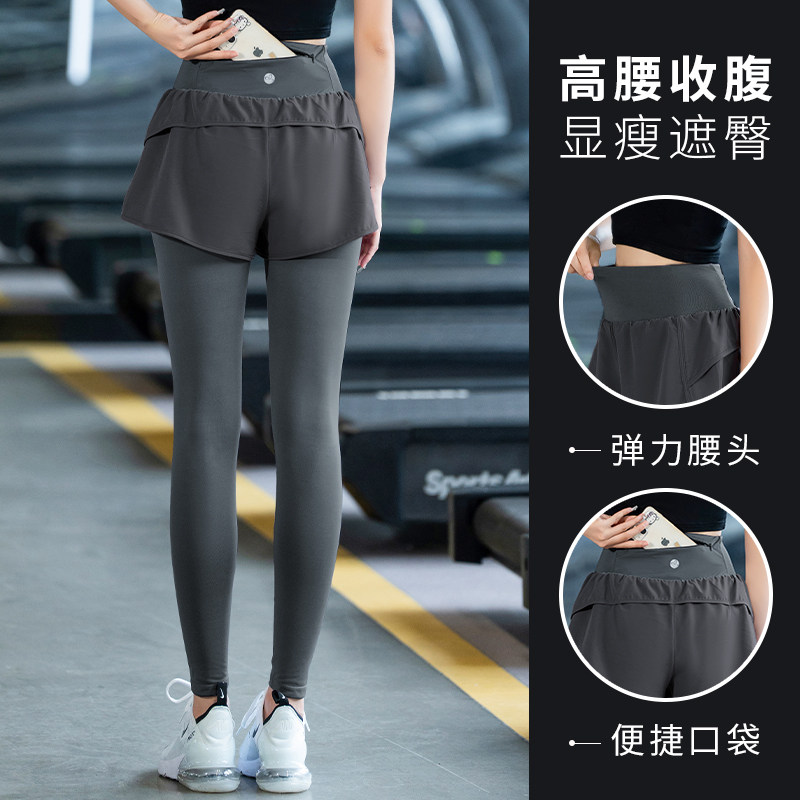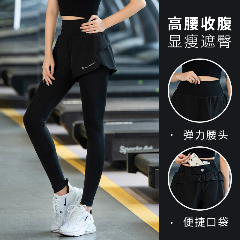 瑜伽裤跑步裤女秋冬新款假两件健身裤高弹力跳操收腹速干加绒黑色