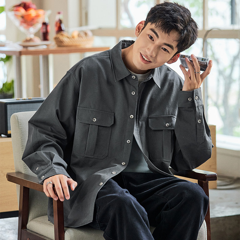 唐狮春秋季新款工装长袖衬衫男士港风日系休闲宽松衬衣外套潮复古