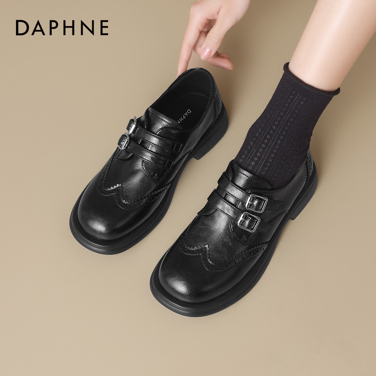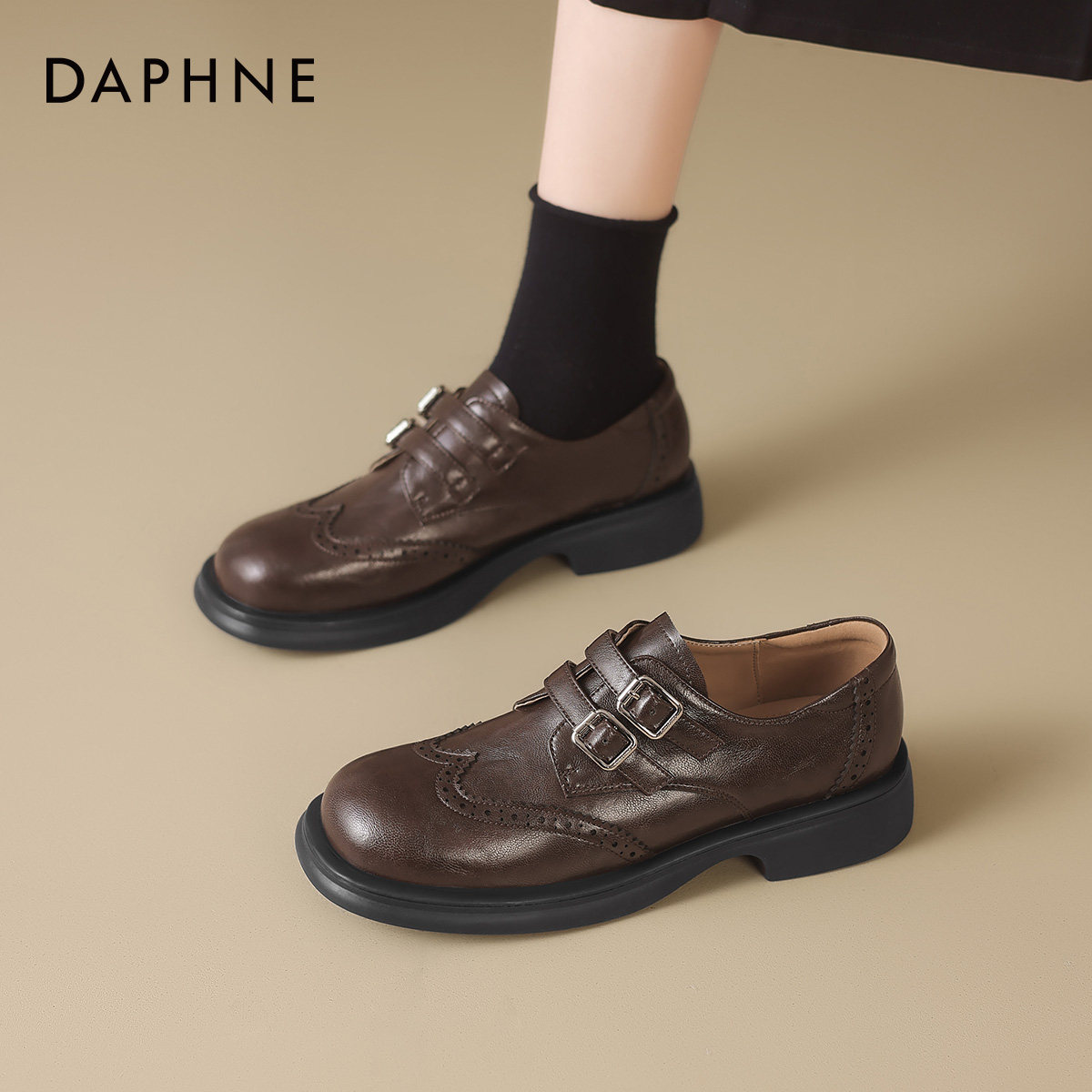 达芙妮棕色乐福鞋春秋季2026新款英伦风牛津小皮鞋低跟布洛克单鞋