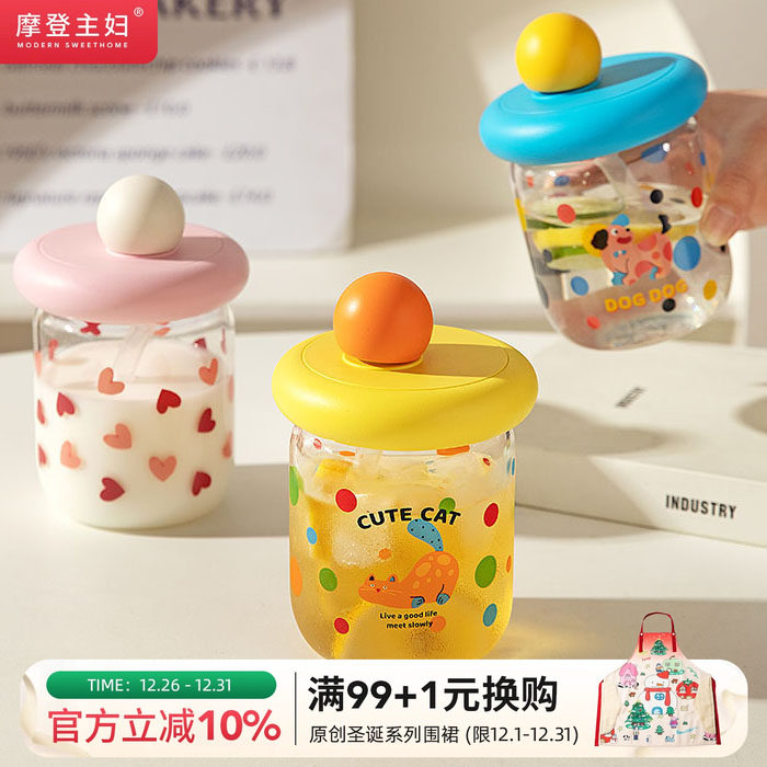摩登主妇玻璃杯带盖牛奶杯豆浆杯咖啡杯外带高颜值水杯女吸管杯子