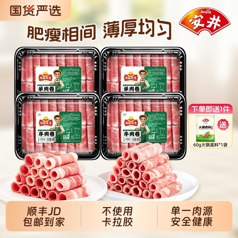 安井×冻品先生涮火锅肥牛羊肉卷150g*4盒方便食材免处理开袋即用