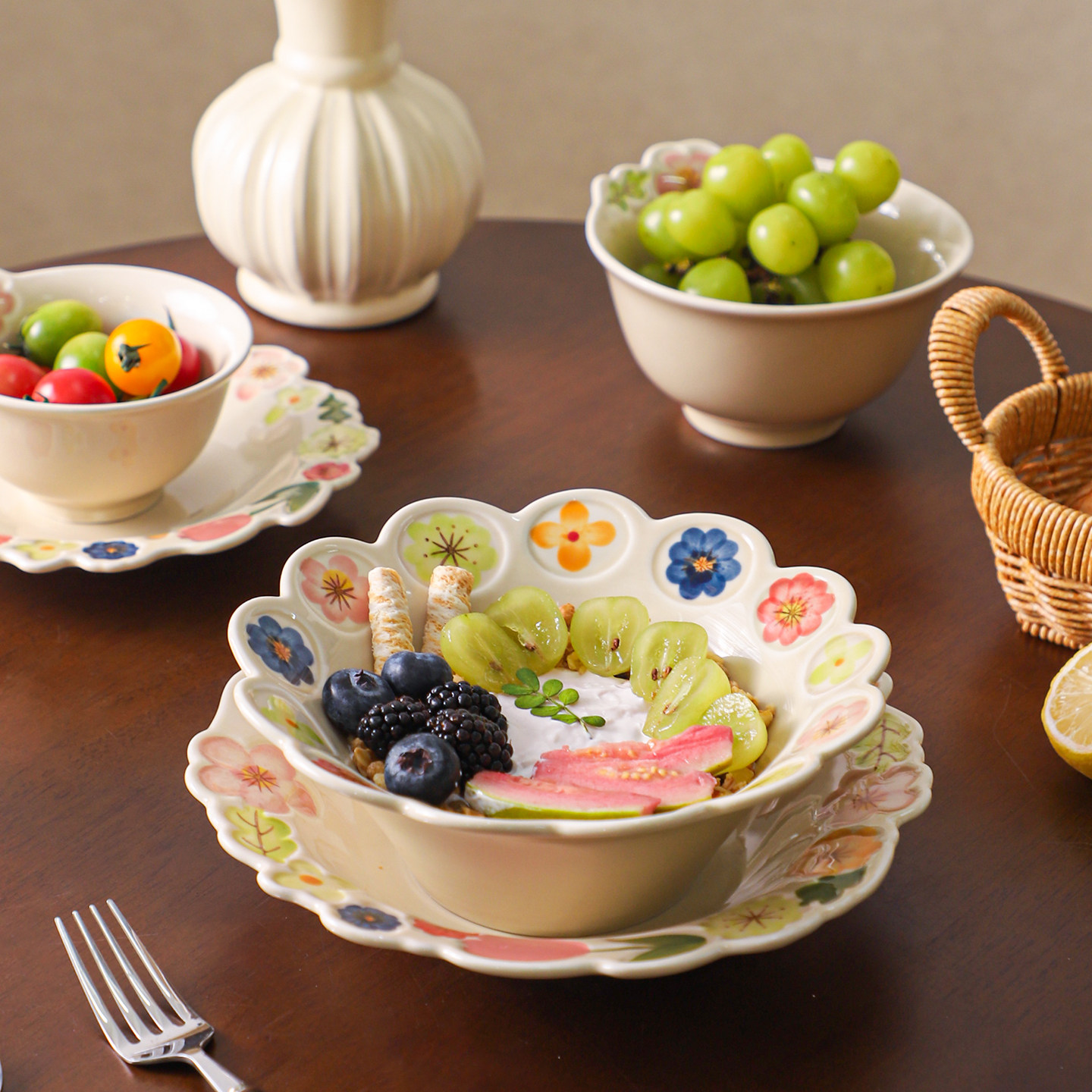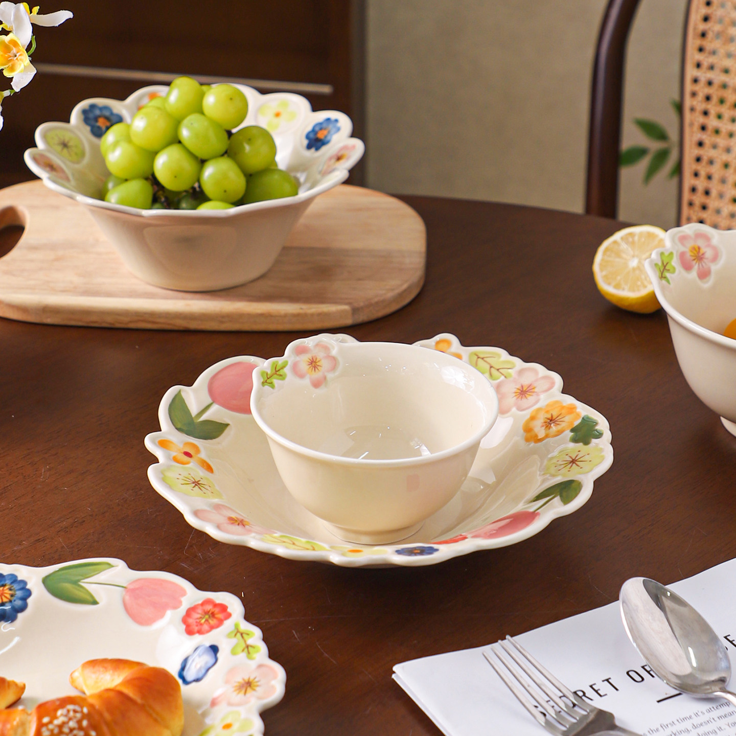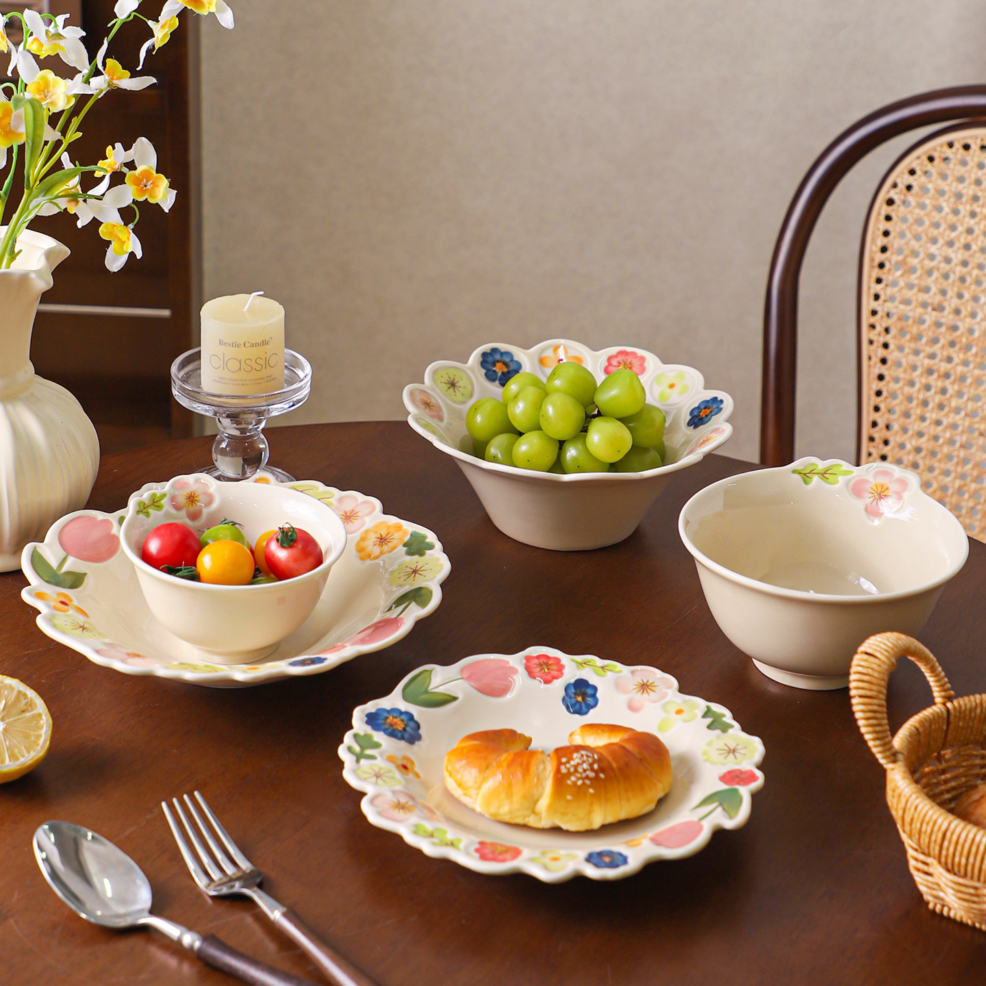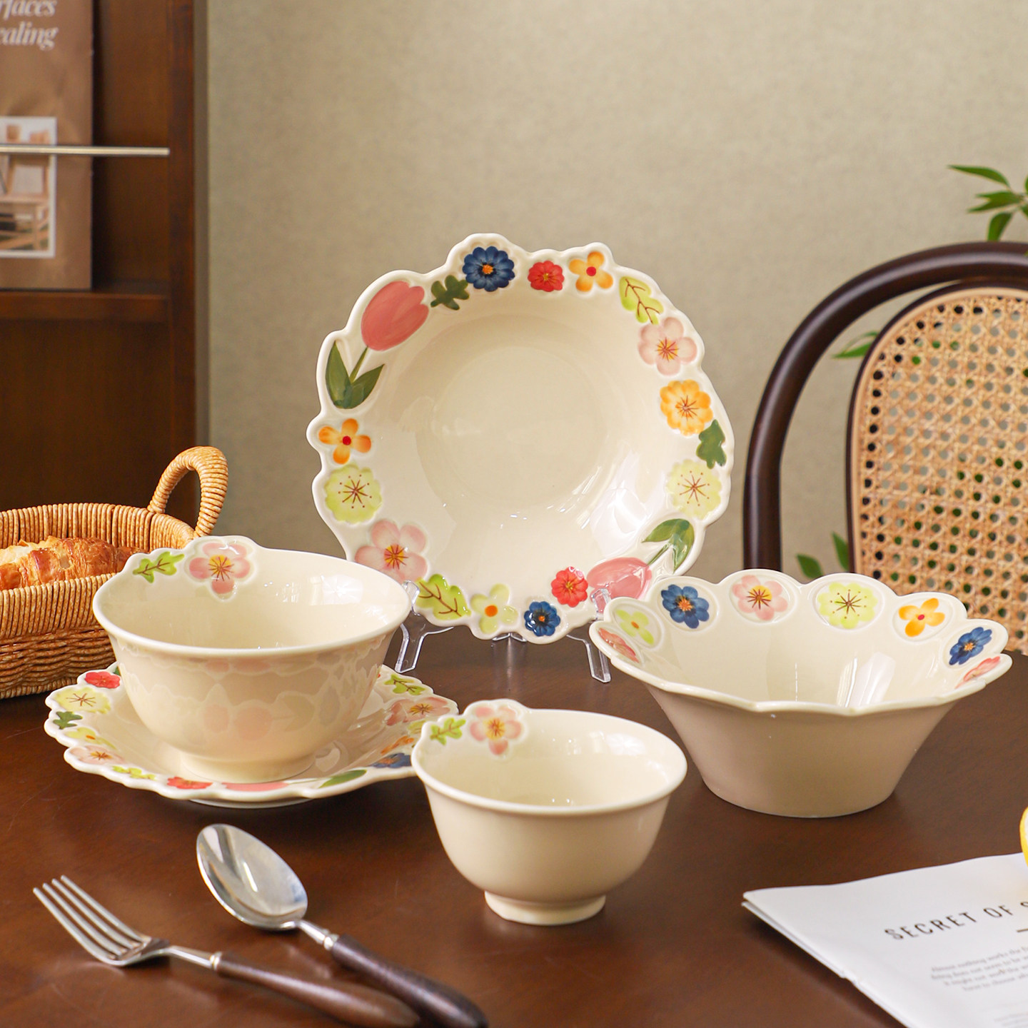 奶油风陶瓷碗家用卡通菜盘子可爱米饭碗汤碗釉下彩儿童餐具耐高温