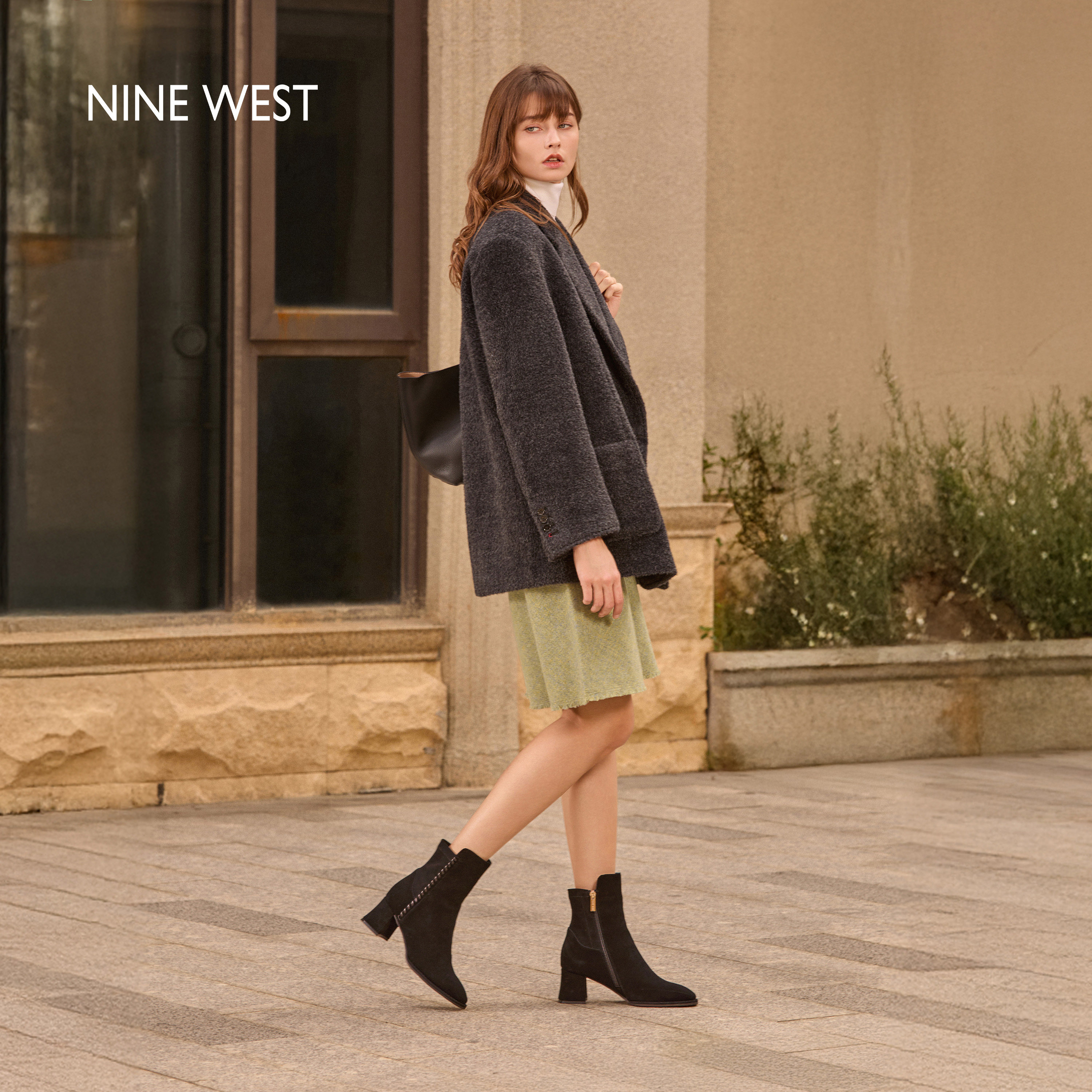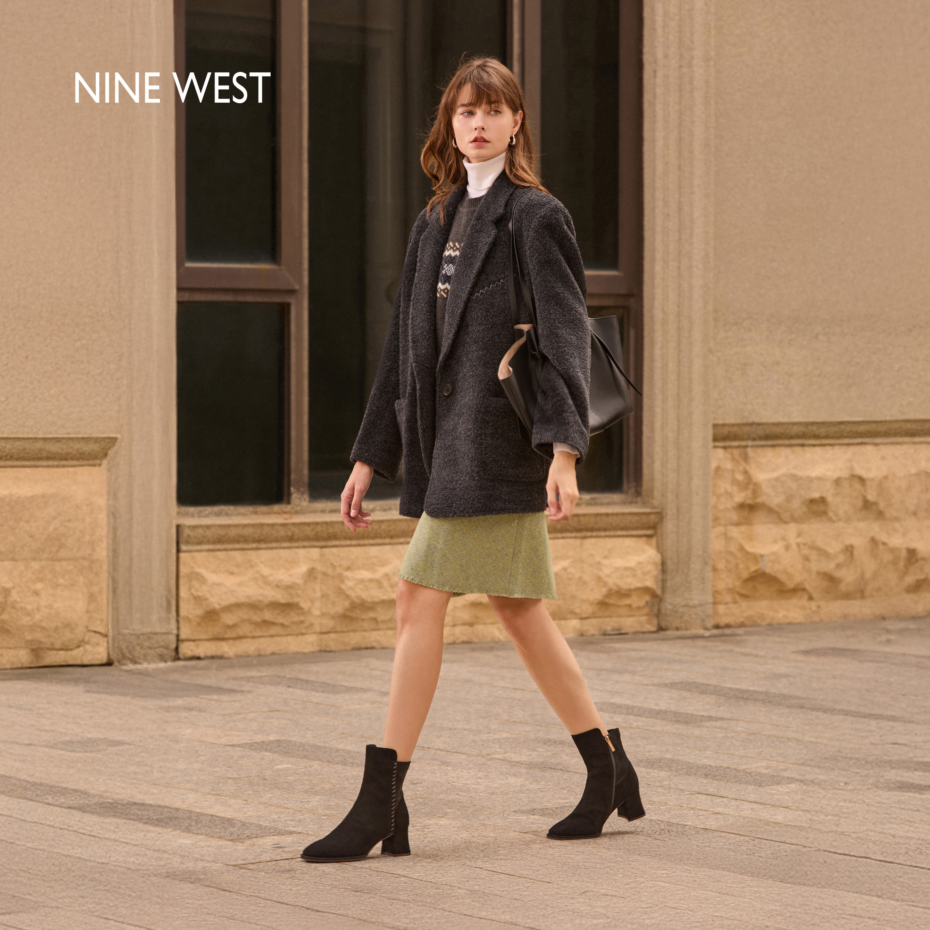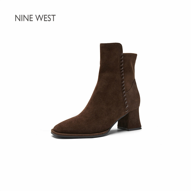 Nine West/玖熙巴恩风加绒短靴女2025冬新款棕色瘦瘦靴粗跟时装靴