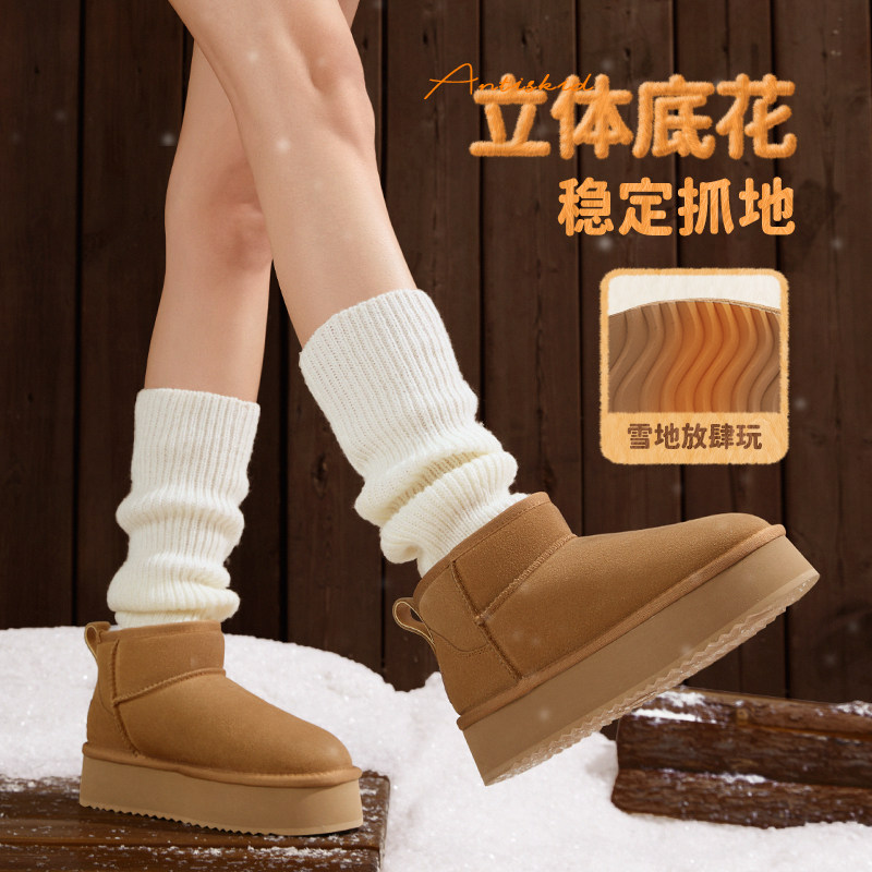 miu家厚底雪地靴女冬季真皮短靴羊毛侧拉链增高厚底加绒毛毛棉鞋
