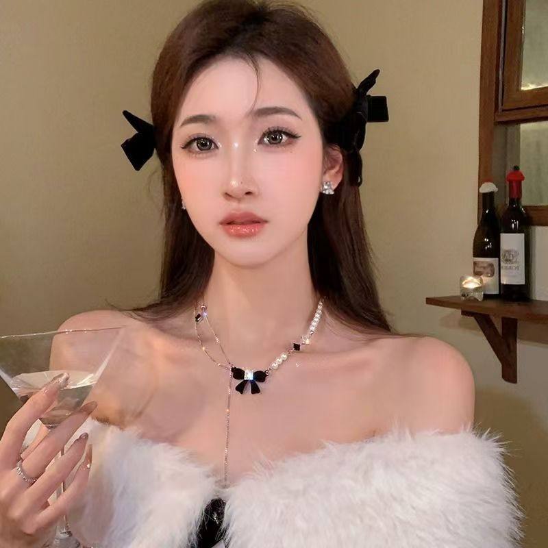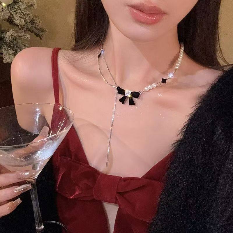 丝绒蝴蝶结项链秋冬新款小众轻奢高级感毛衣链颈链潮多层锁骨吊坠
