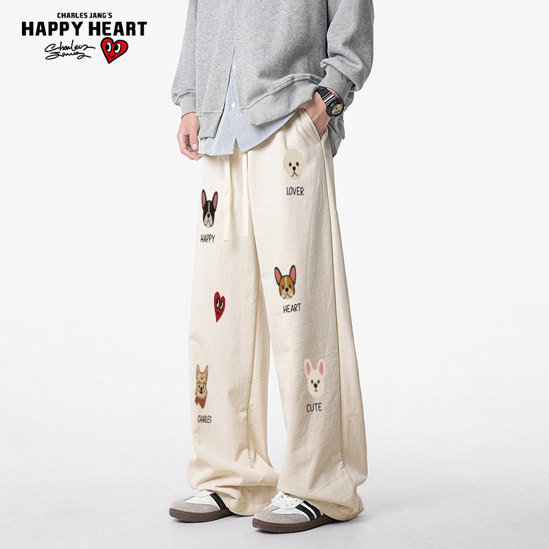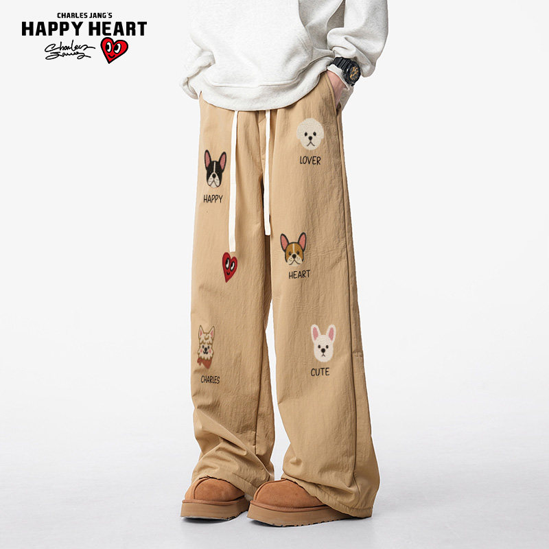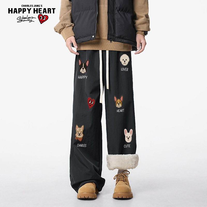 查尔斯桃心 趣味小狗印花直筒裤子男女冬季北极绒加厚保暖休闲裤