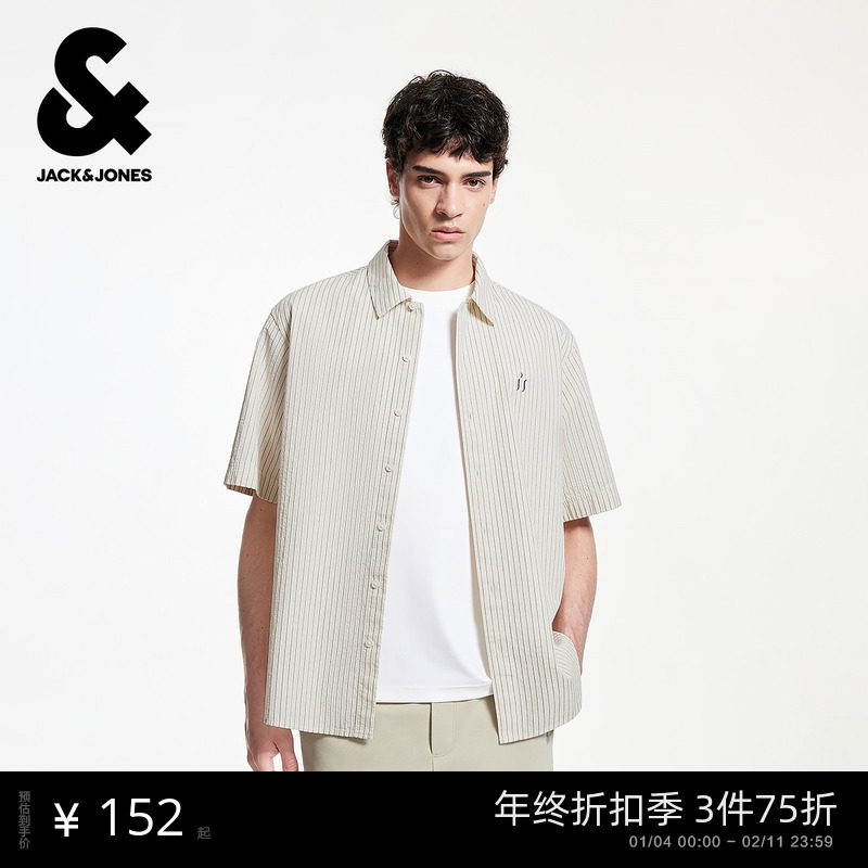 杰克琼斯男装秋季新款衬衫舒适百搭精致刺绣衣身条纹翻领短袖衬衫