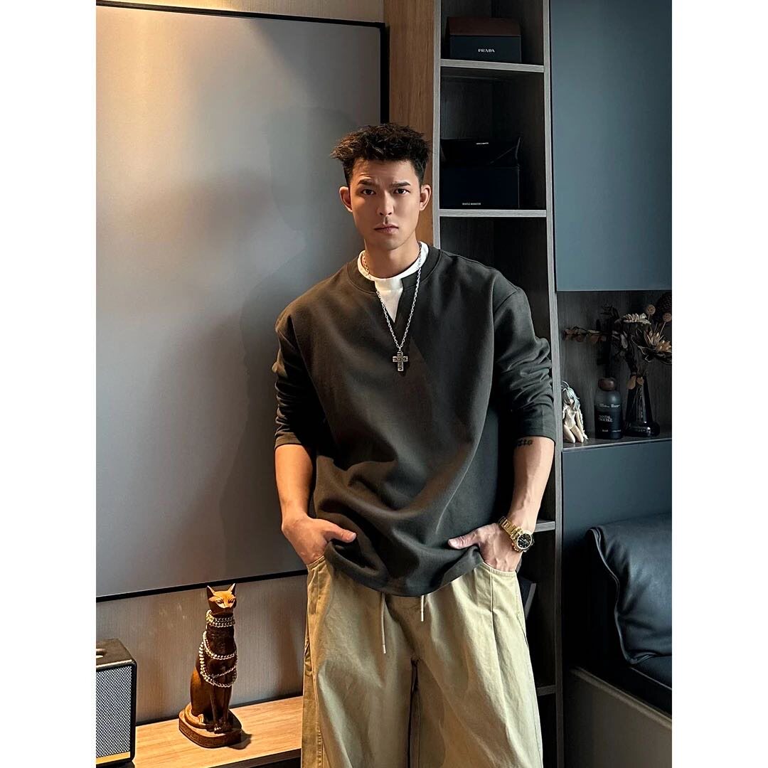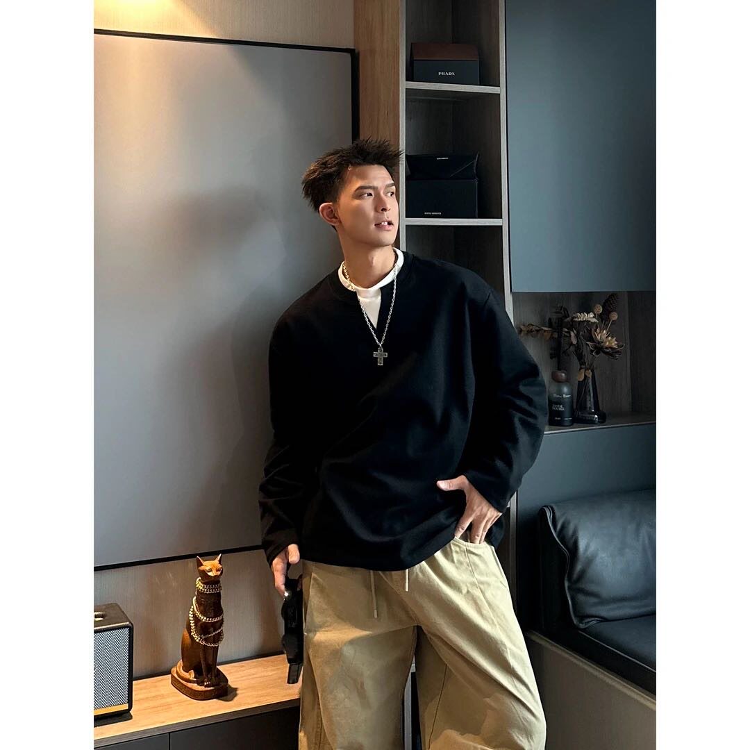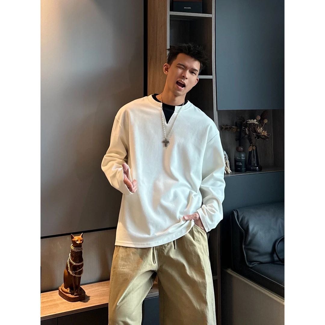 秋冬季重磅纯棉380g假两件设计领口拼色简约百搭时尚宽松卫衣情侣