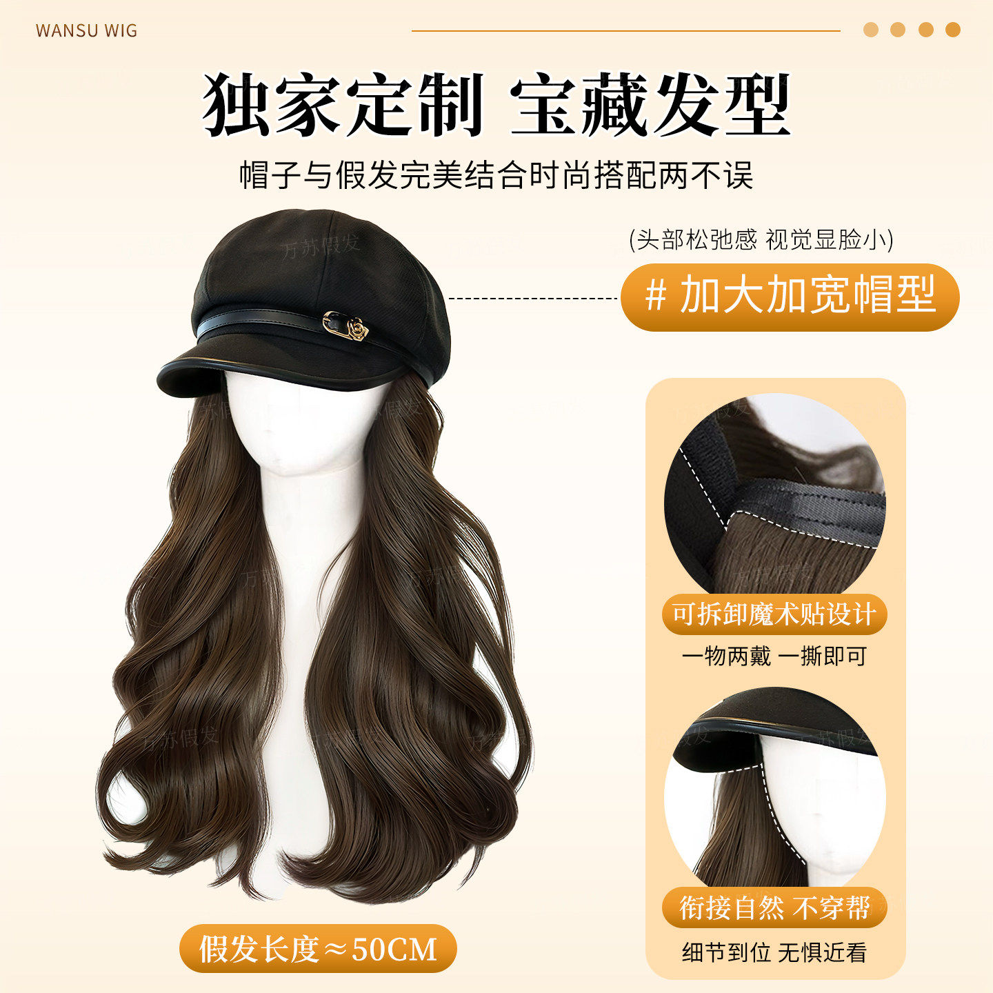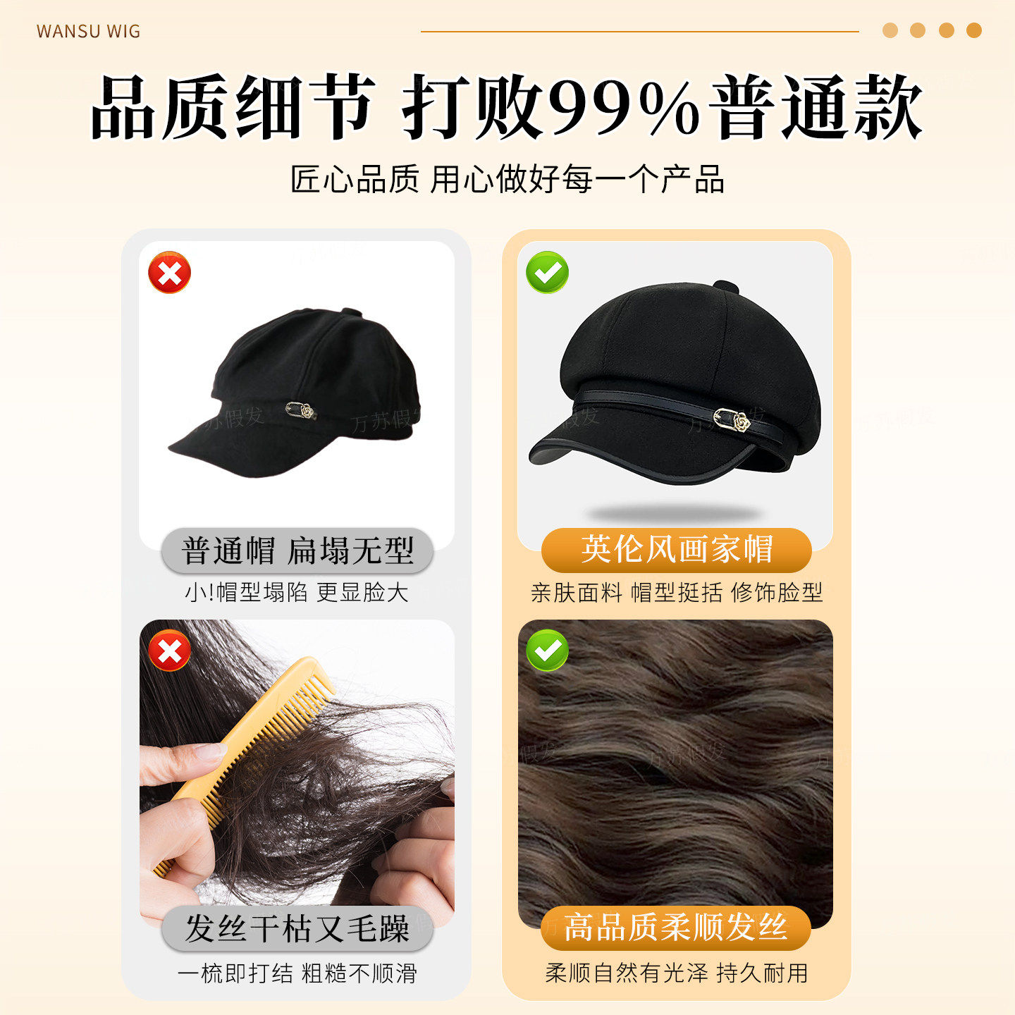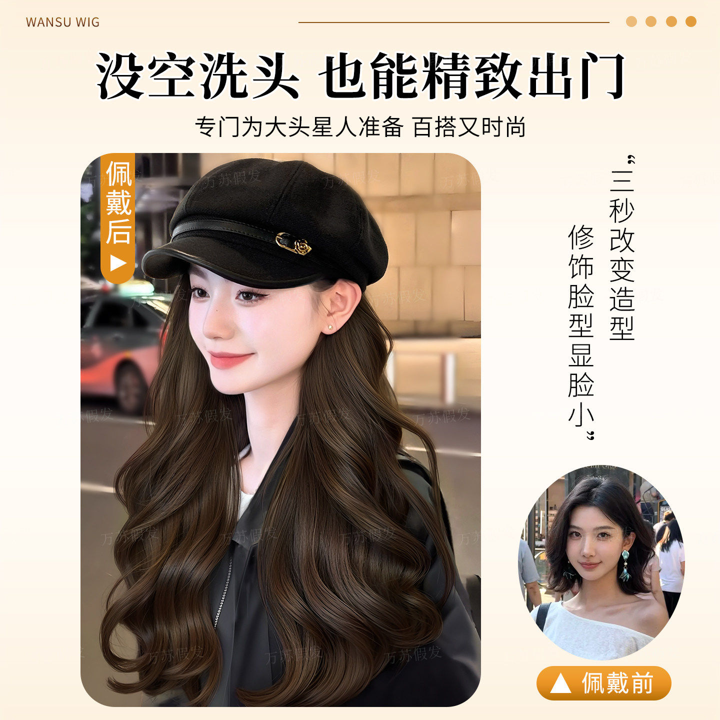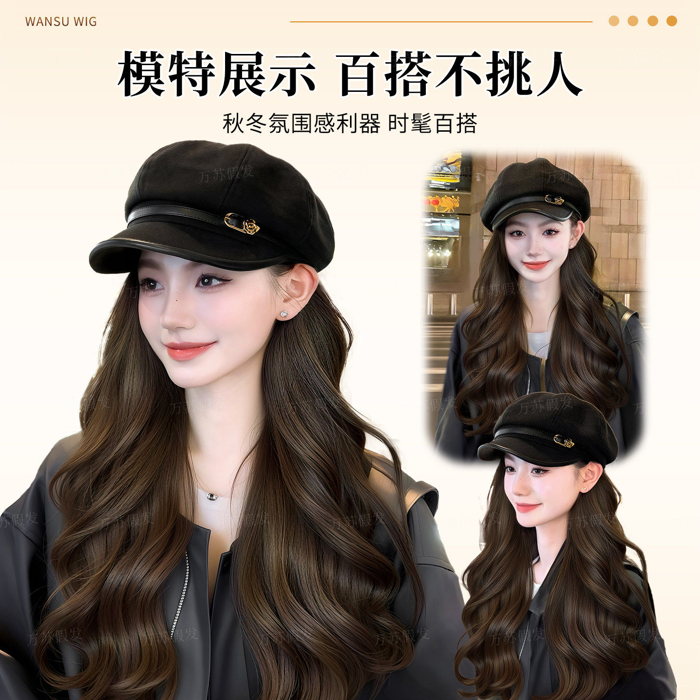 帽子假发一体八角贝雷帽秋冬自然卷发量女全头套可拆卸显脸小发型