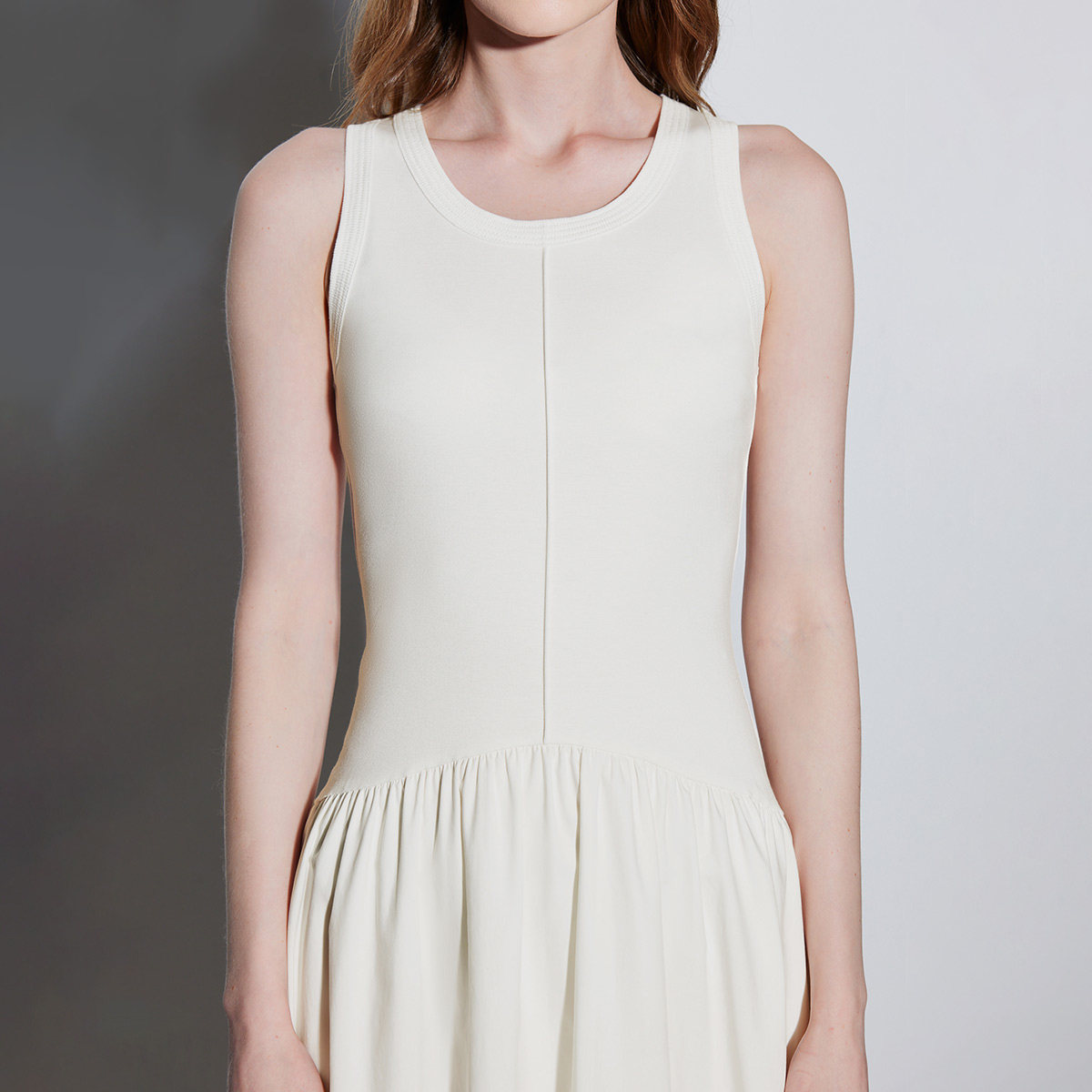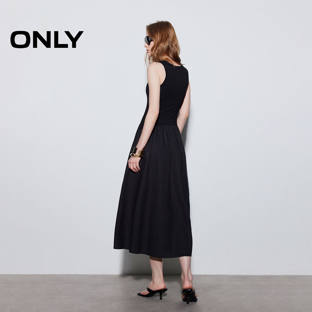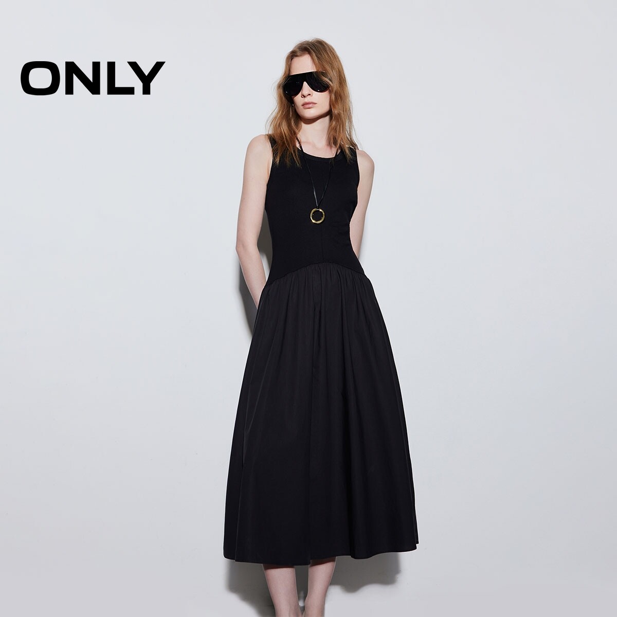ONLY2026春季新款松弛感U领无袖裙子拼接腰间抽褶长裙连衣裙女
