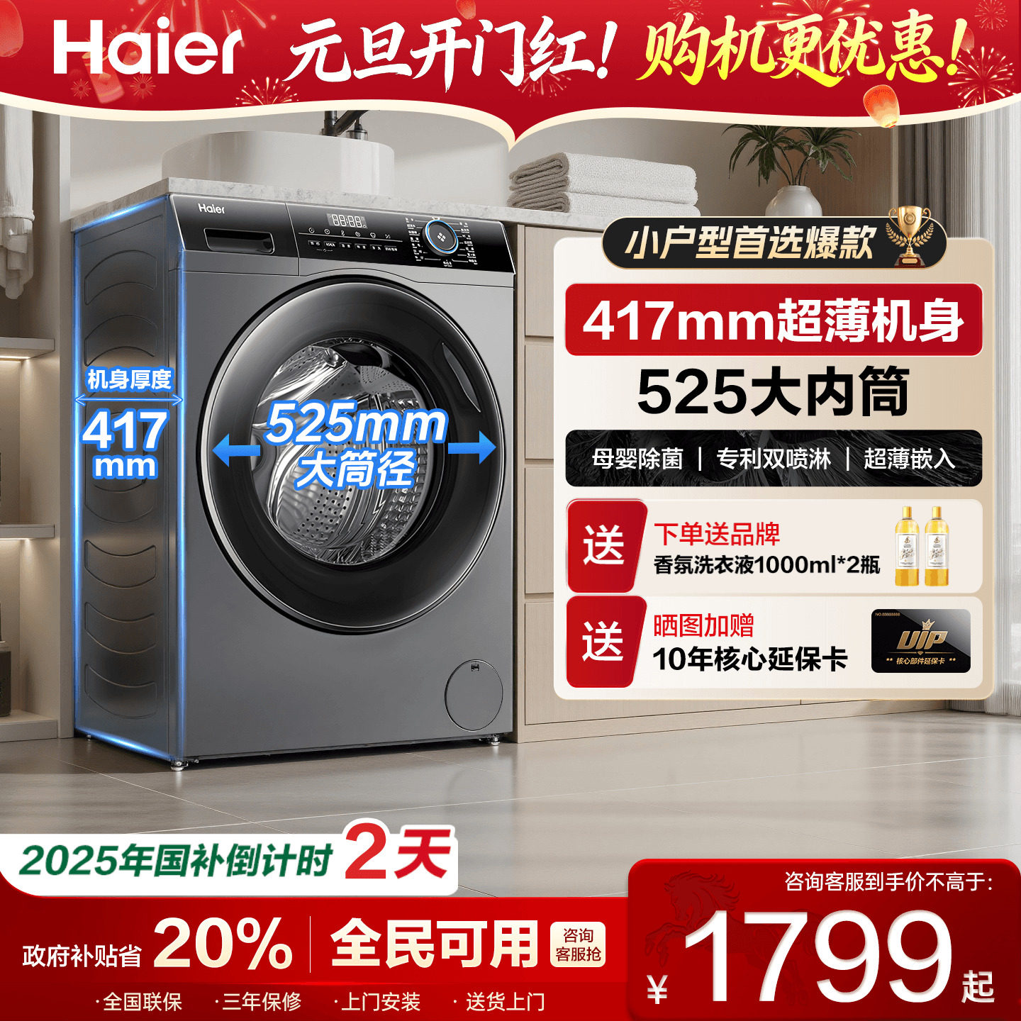 海尔超薄滚筒洗衣机40cm纤薄款8/9/10kg全自动烘干小户型家用统帅