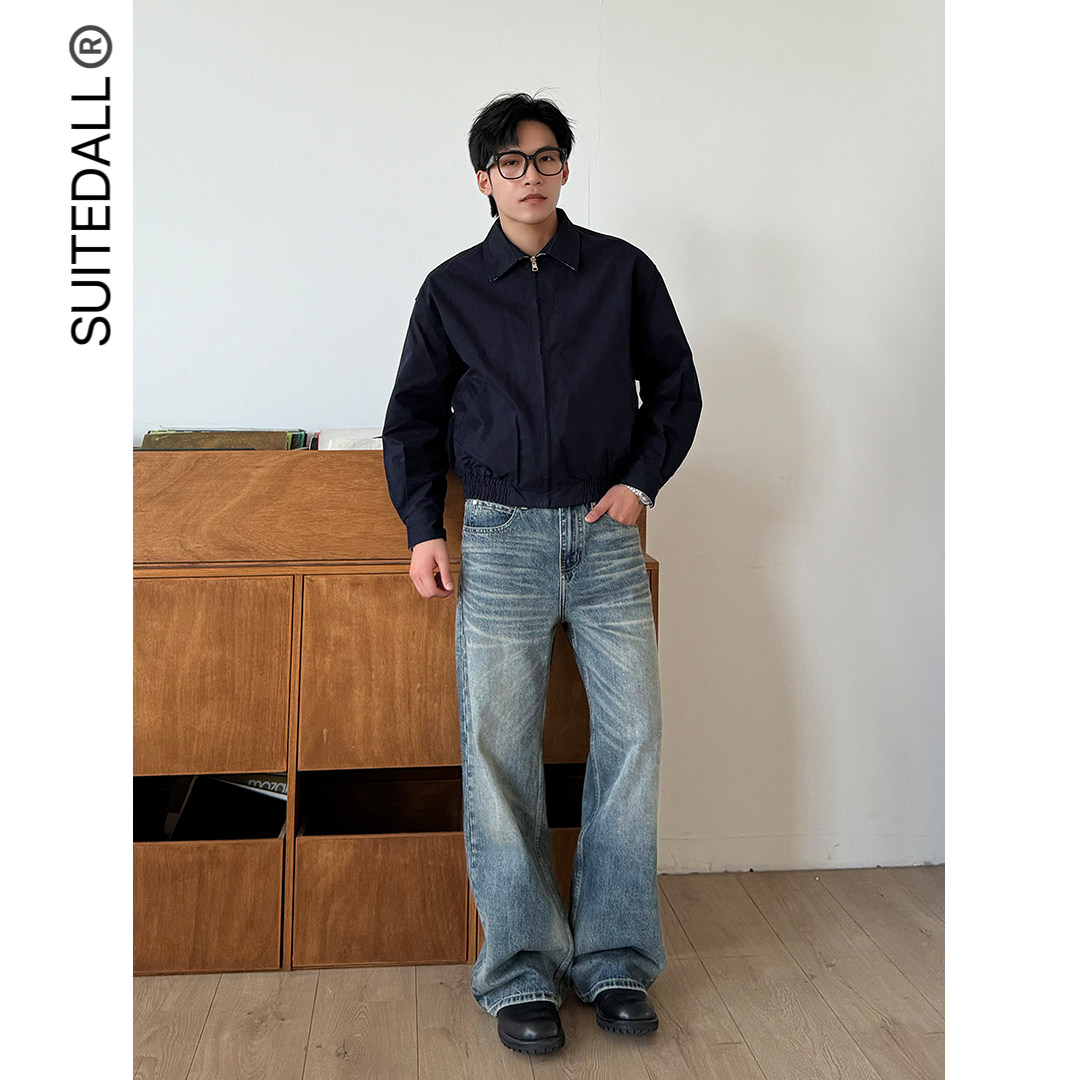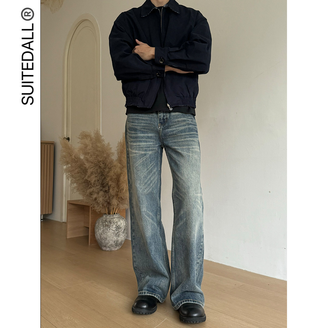 SUITEDALL复古蓝牛14oz宽松直筒A字立体猫须基础百搭休闲牛仔长裤