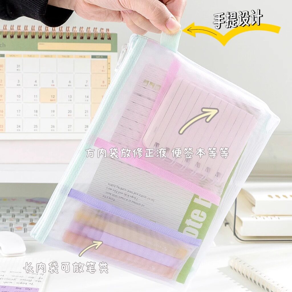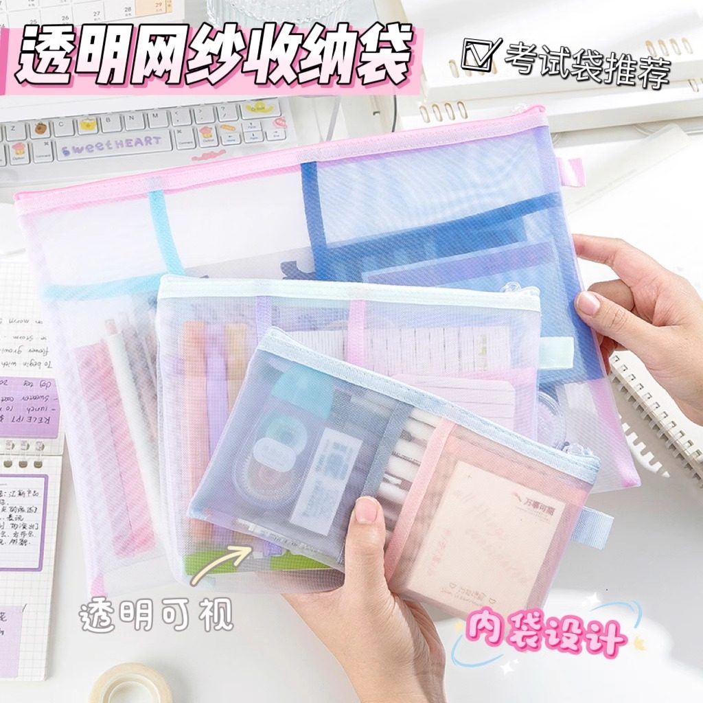 A4文件袋透明网纱撞色多层分类考试用a5大容量A6笔袋化妆刷收纳袋