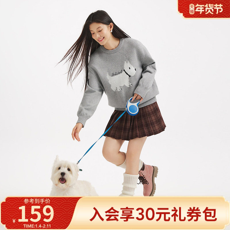 热风2025年冬季新款女士动物小狗圆领针织衫甜美时尚减龄