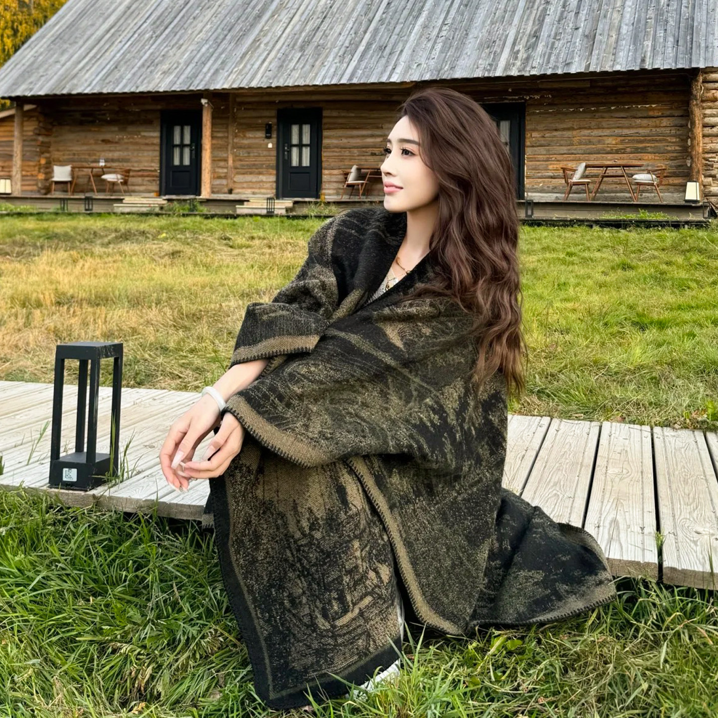 云南丽江民族风蓝色旅游披肩女外搭氛围感时尚披风斗篷针织围巾女