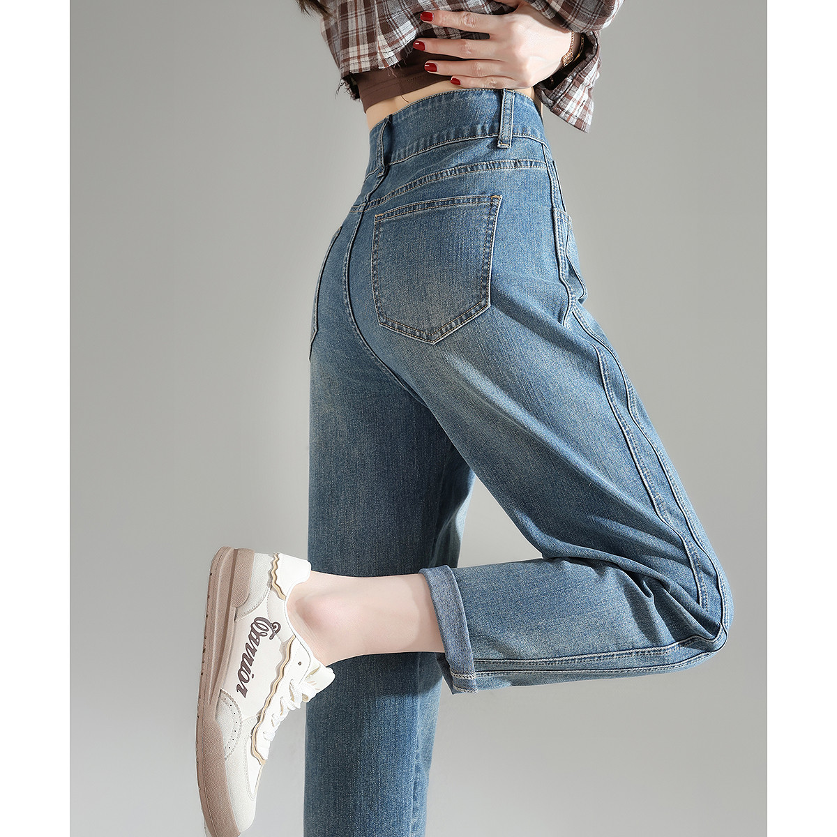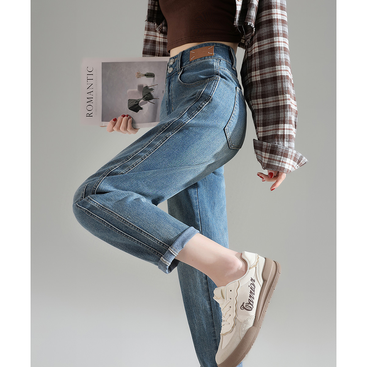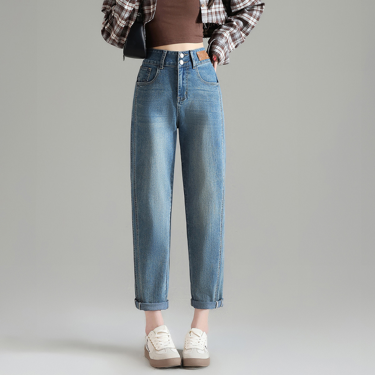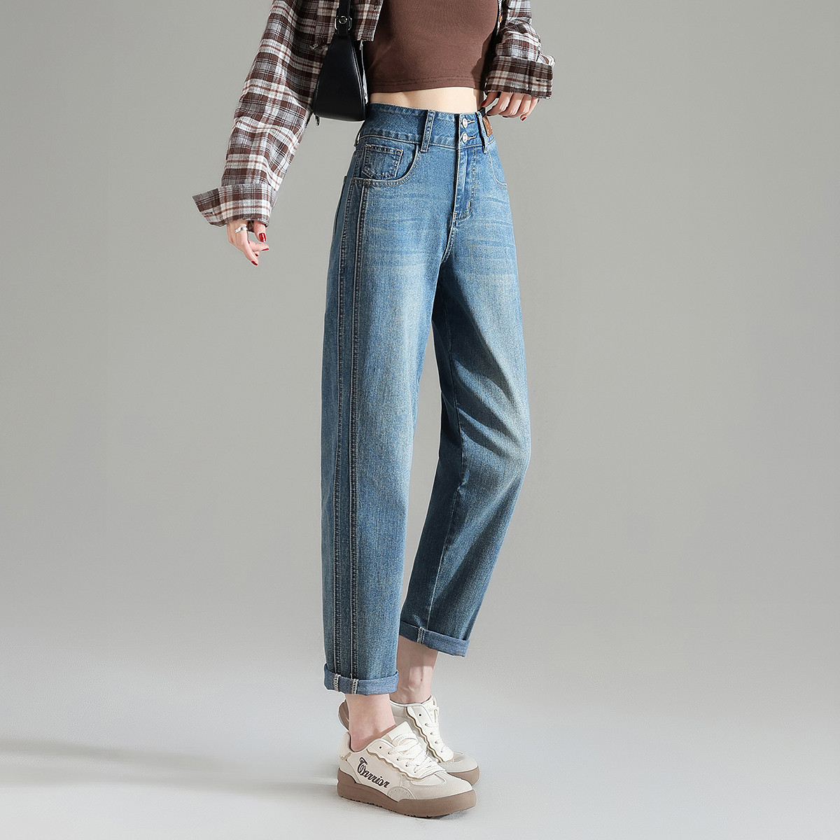 唐狮春季新款高腰牛仔裤女宽松直筒哈伦裤显瘦复古水洗潮流裤子TD