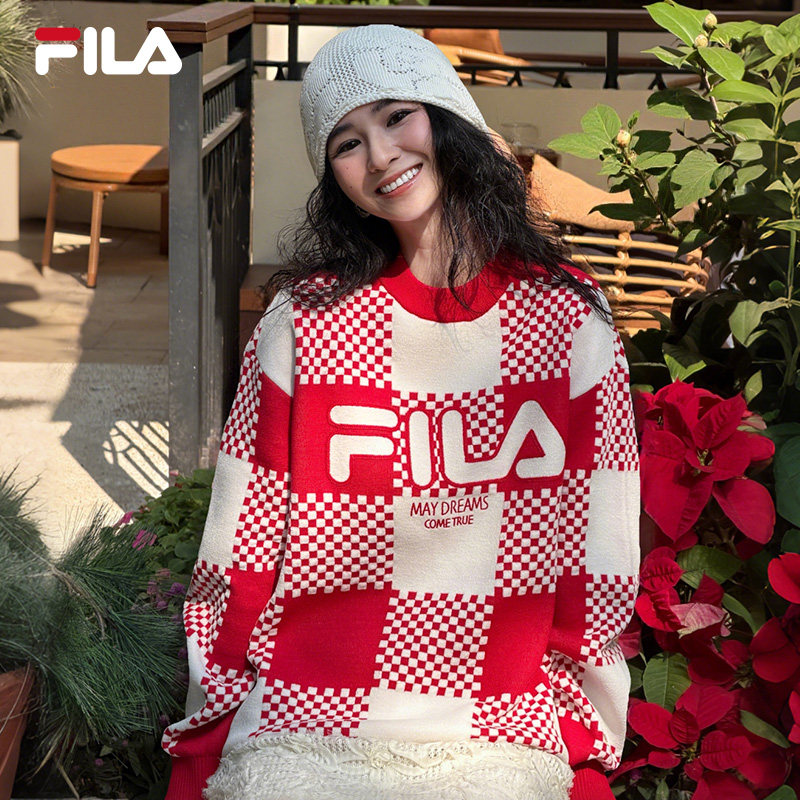 马上起飞FILA斐乐官方情侣长袖毛衣女编织保暖红色新年运动上衣男