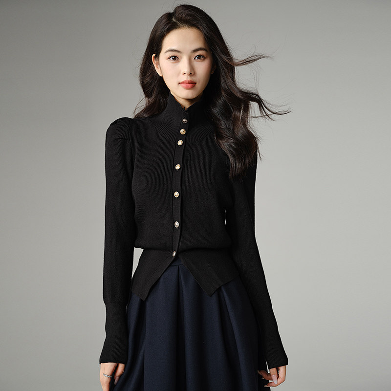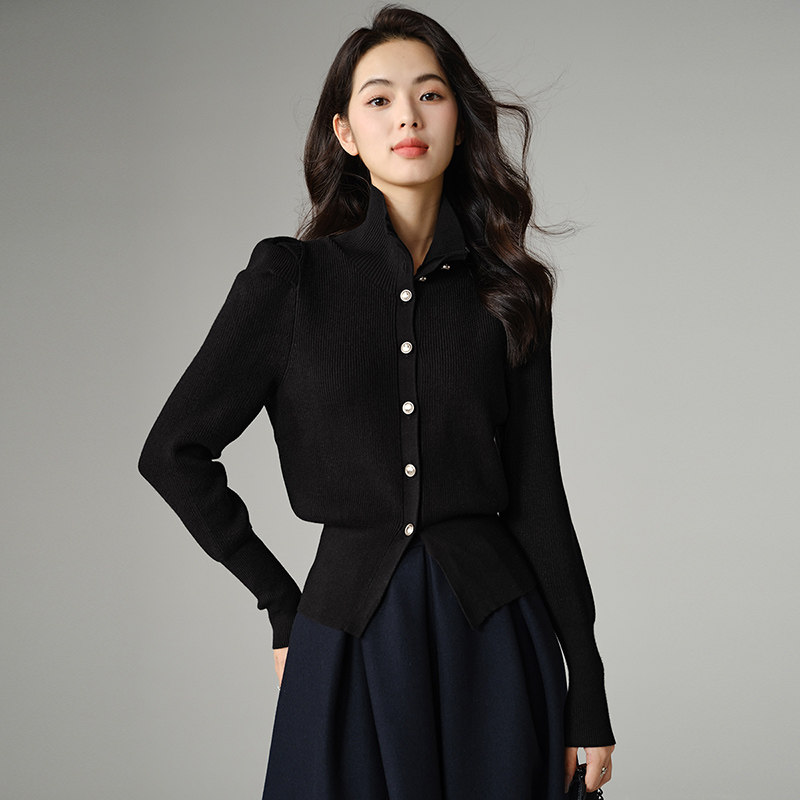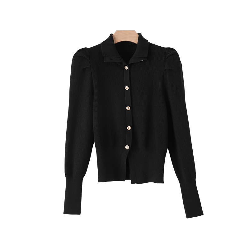 晚白2025年秋冬新款时尚简约气质毛衣百搭纯色泡泡袖针织外套女